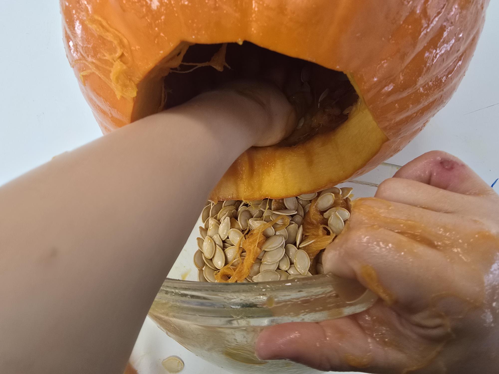 Die Kinder durften sich dabei abwechseln, um die vielen Kerne herauszuholen. Das war ganz schön glitschig und hat für viel Gelächter gesorgt!