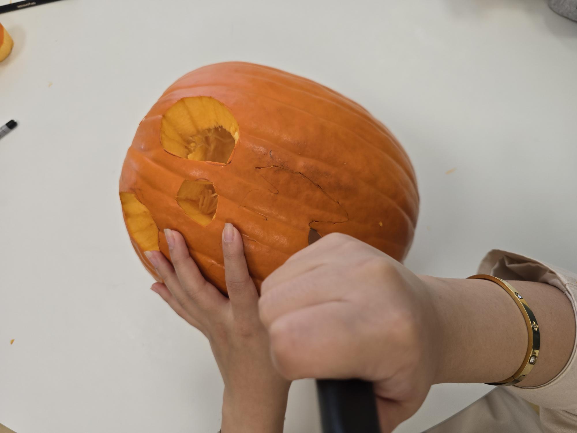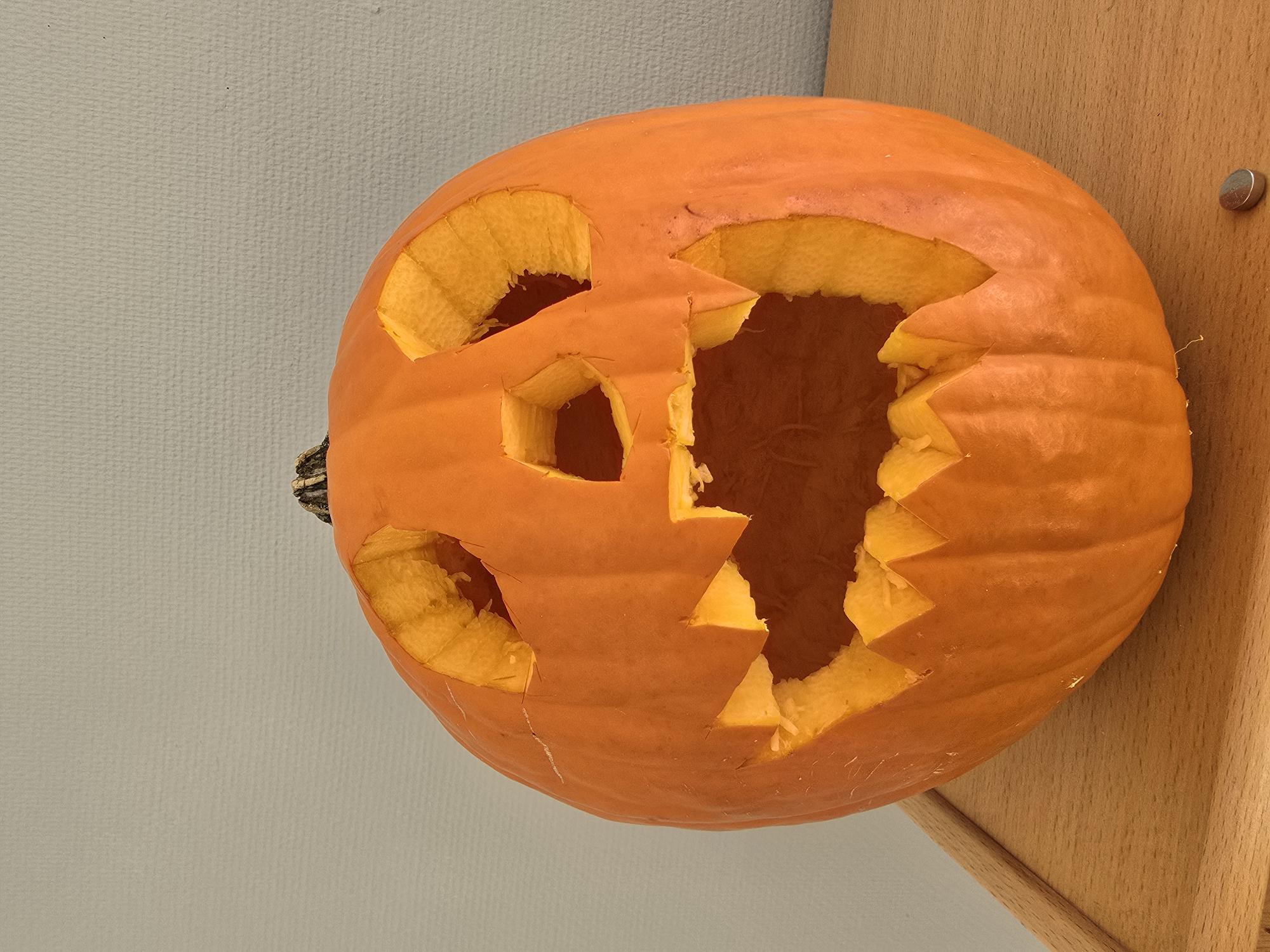 Anschließend durfte ein Kind das Gesicht des Kürbisses aufzeichnen, das wir dann gemeinsam ausgeschnitzt haben.