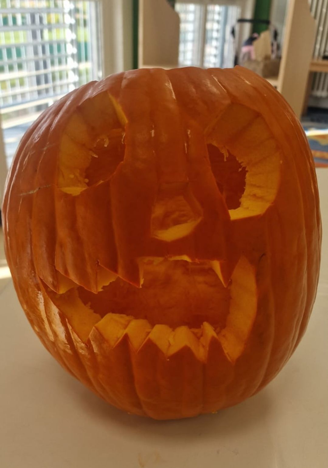 So entstand unser gruselig-lustiger Halloween-Kürbis, der nun unser Gruppenzimmer schmückt und uns auf die bunte Herbstzeit einstimmt.