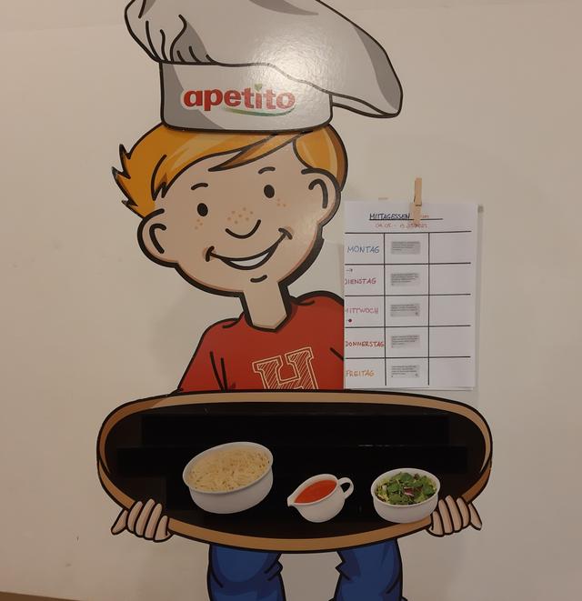 Im Eingangsbereich gibt es für die Kinder und Eltern Bilder vom tagesaktuellen Essen und eine Menüübersicht für die ganze Woche.