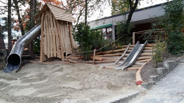Der große Sandbereich, eine Tunnelrutsche, zwei Schaukeln, Balancierstämme, verschiedene Fahrzeuge, ein Klettergerüst mit einer Hängebrücke, große Findlinge zum Klettern und eine große Wiese, ermöglichen es den Kindern, ihren Bewegungsdrang auszuleben.