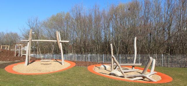 Ein weitläufiges Gartengelände mit Fußballplatz, Basketballkkorb, Bodentrampolinen, Rasenflächen und Terrassen, sowie Klettergerüst, Schaukeln und Sitzpodesten bietet viele Spiel- und Bewegungsmöglichkeiten. Außerdem stehen den Kindern verschiedene mobile Außenspielmaterialien zur Verfügung.