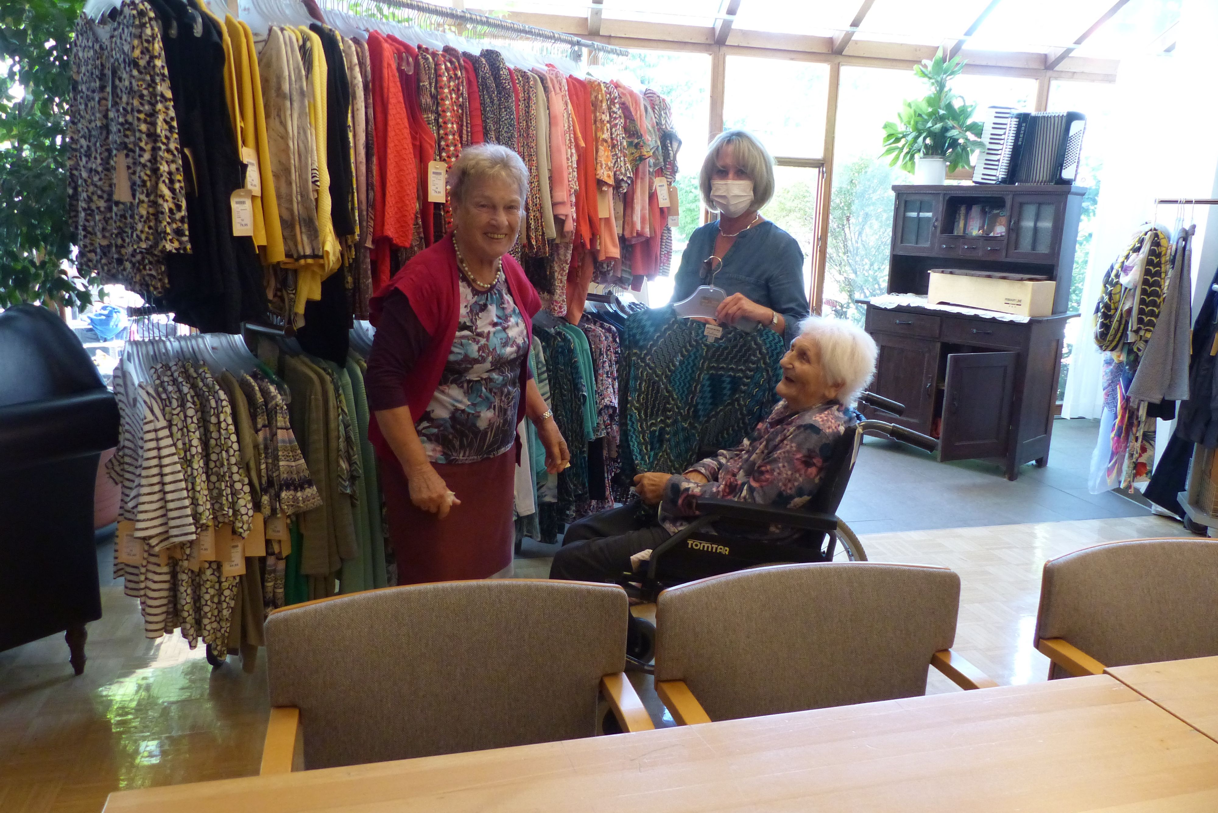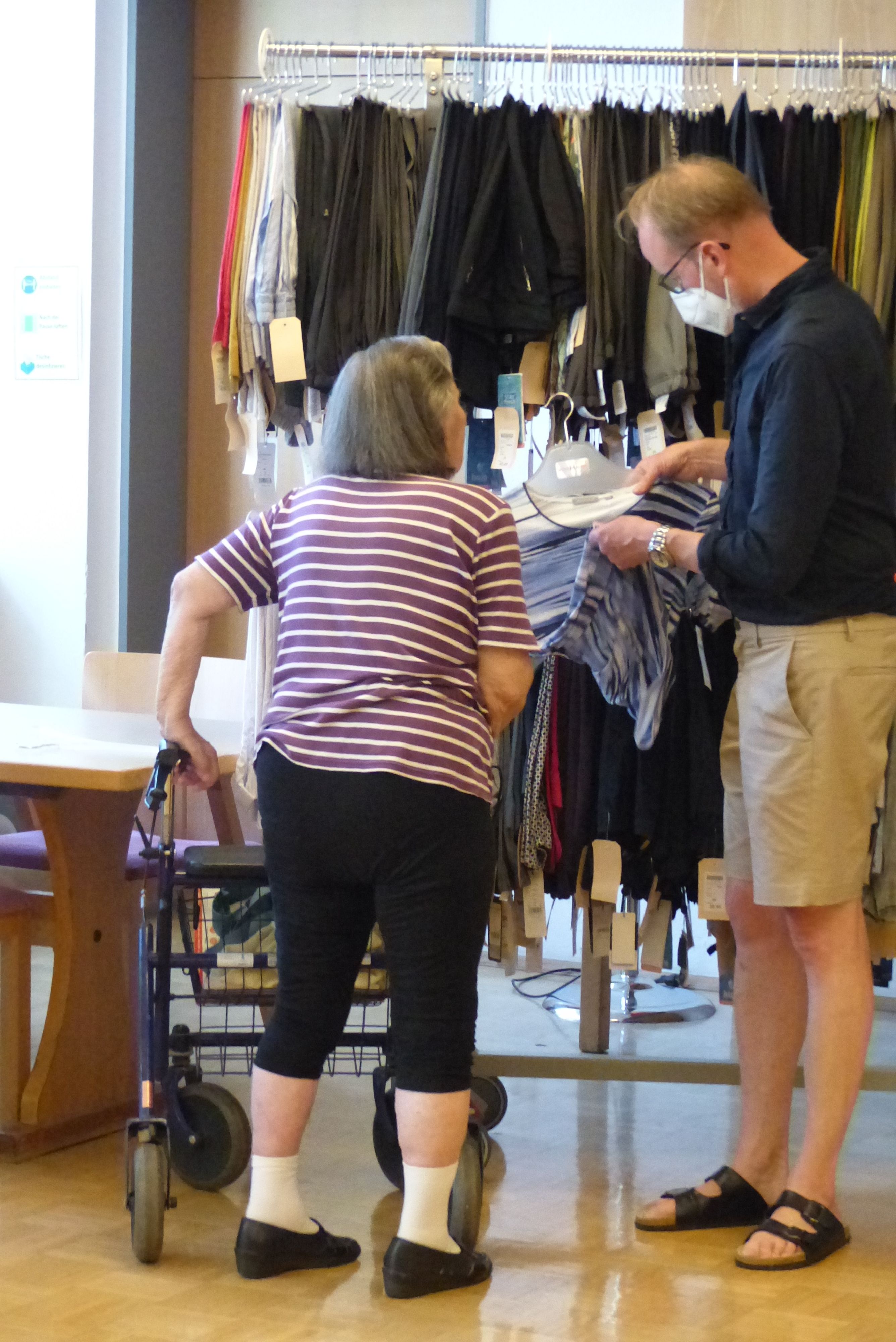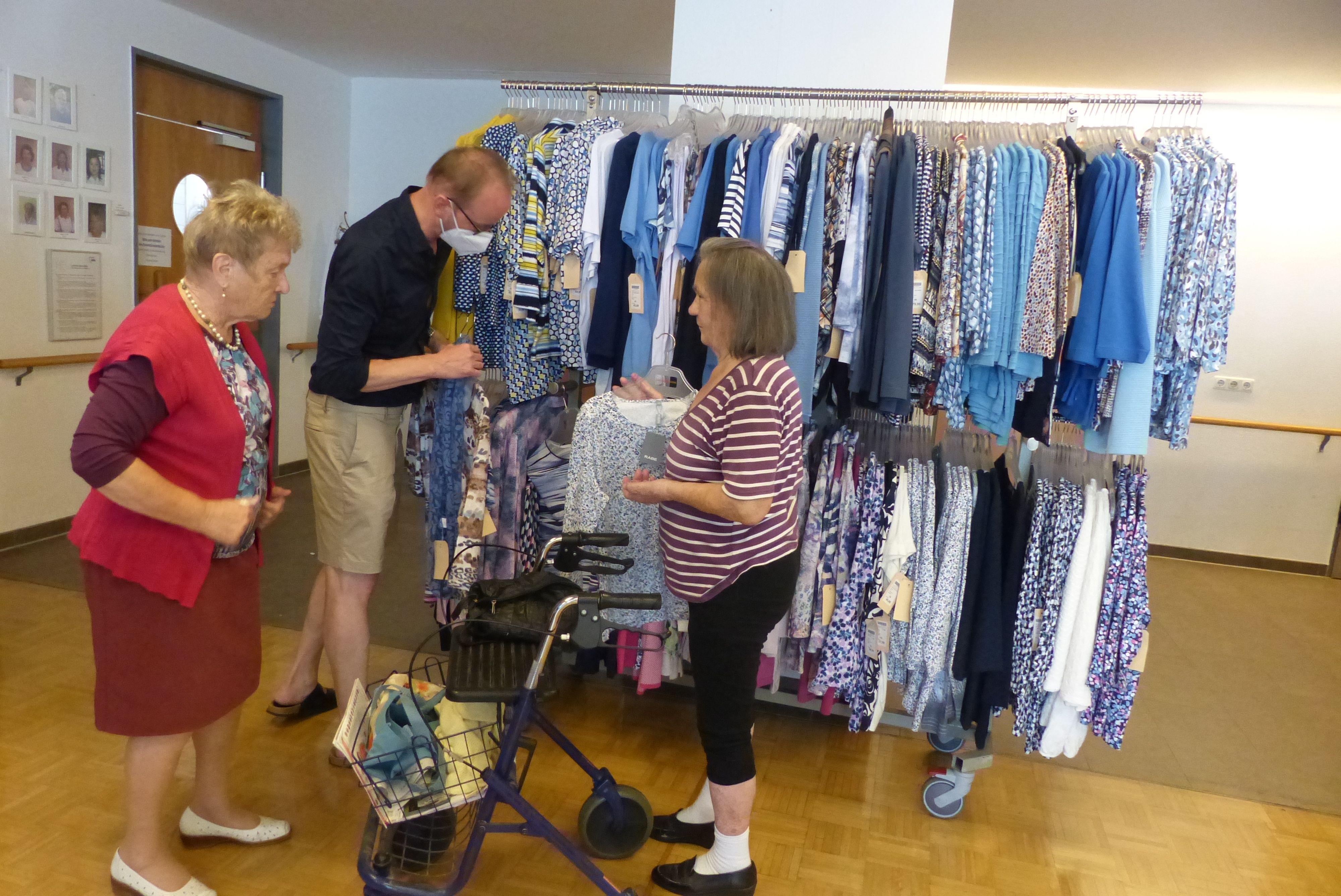 Mit Beginn der Coronapandemie 2020 beendete Witt-Weiden sein Engagement in den Senioreneinrichtungen und löste seine mobile Abteilung, die die Pflegeheime besuchte auf. Aber wenn eine Tür sich schließt geht in der Regel eine andere Tür auf. So auch in diesem Fall. Im Mai dieses Jahres konnten wir mit einer neuen Modefirma einen Verkaufstermin vereinbaren. Mit ihrem vollgepackten Transporter fuhr am Dienstag, den 9. August Frau Kries von der Firma ModeMobil auf unseren Hof. Gemeinsam mit ihrem Mitarbeiter brachte sie die vielen Kleiderständer mit der Sommerkollektion in den Terofalsaal. Blusen, Jacken und Hosen für die Damen. Hemden, Pullover und Hosen für die Männer. Wäsche, Socken, Schals und Schuhe, für jeden Besucher war etwas dabei. So nutzten auch viele Seniorinnen und Senioren den Verkaufsnachmittag. Auch einige Angehörigen schauten vorbei und gingen mit ihren Senior*innen im Terofalsaal bummeln.