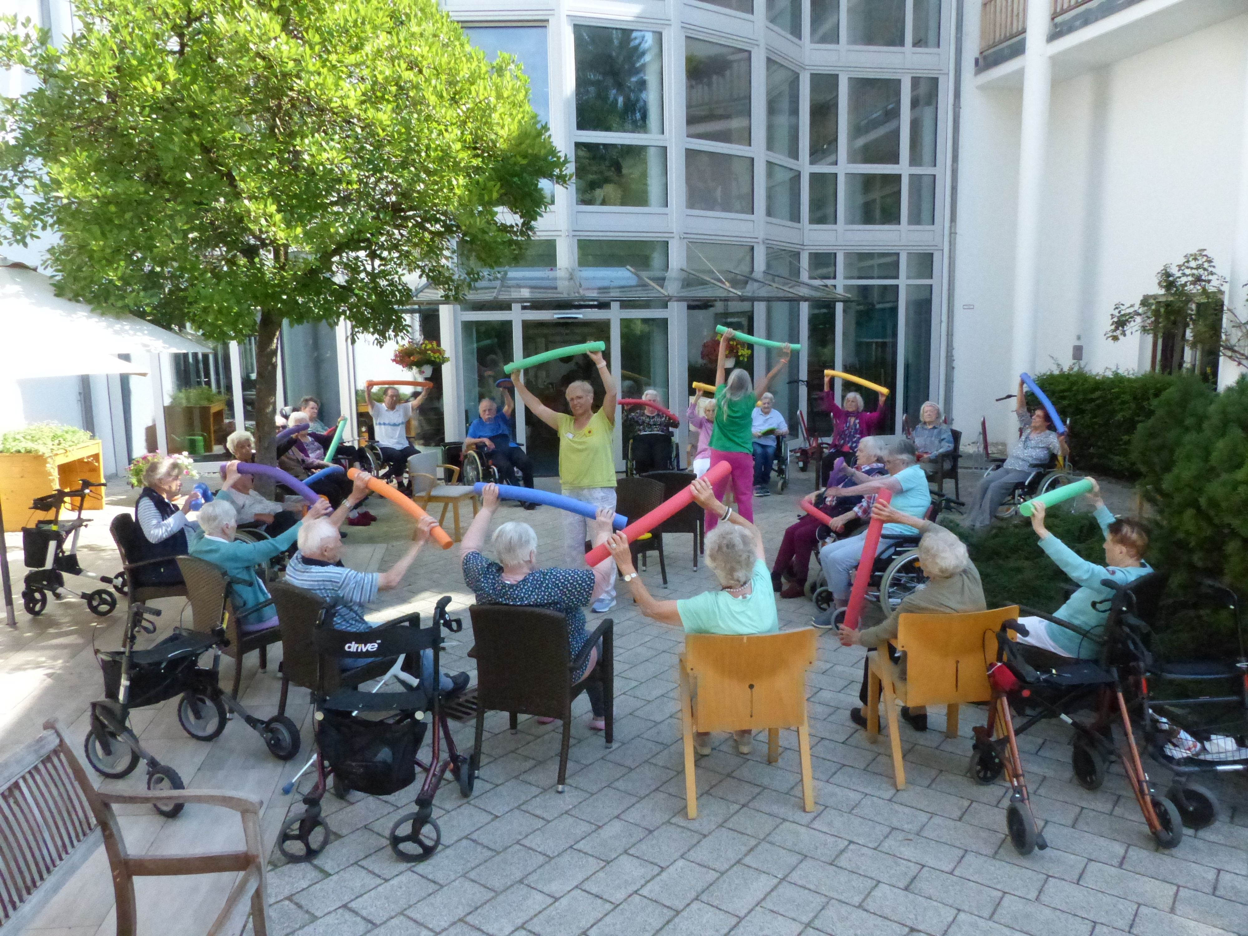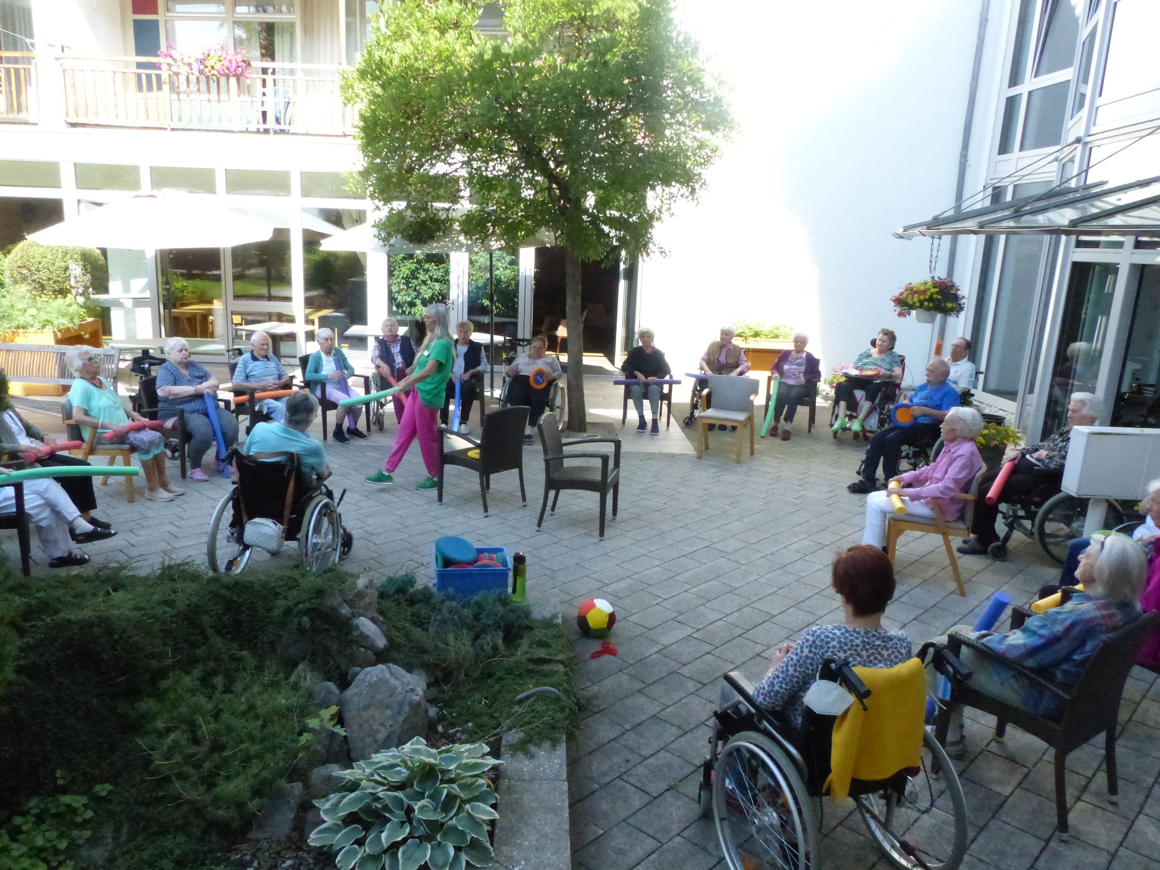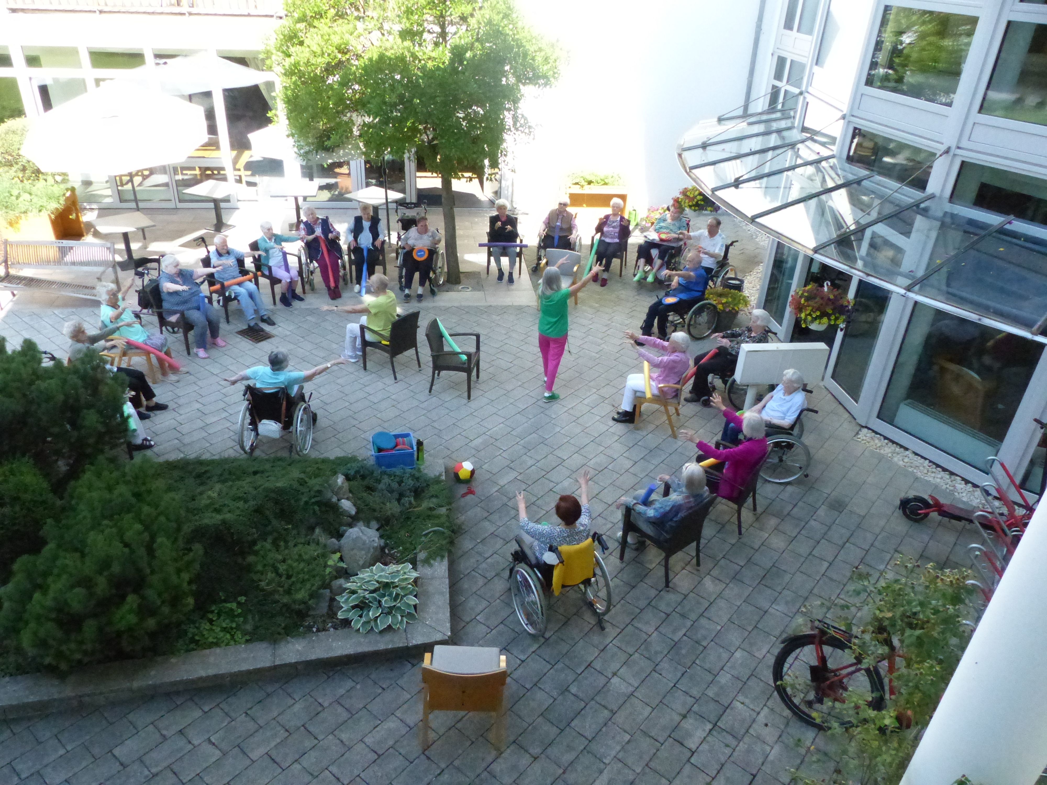 Das Sommerwetter wird sofort ausgenutzt und alle bewegungstüchtigen Bewohner versammelten sich zur Sitzgymnastik im Freien.