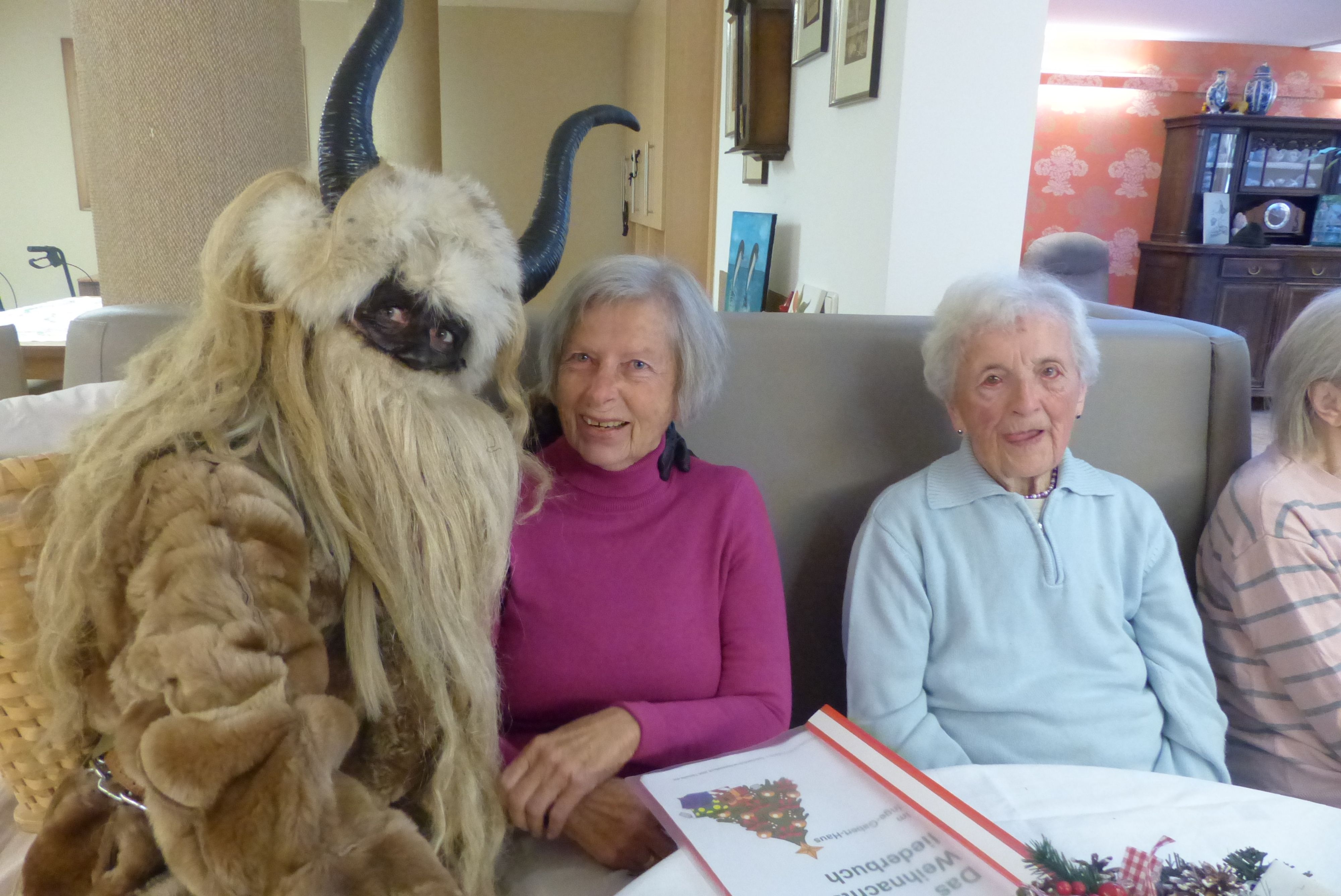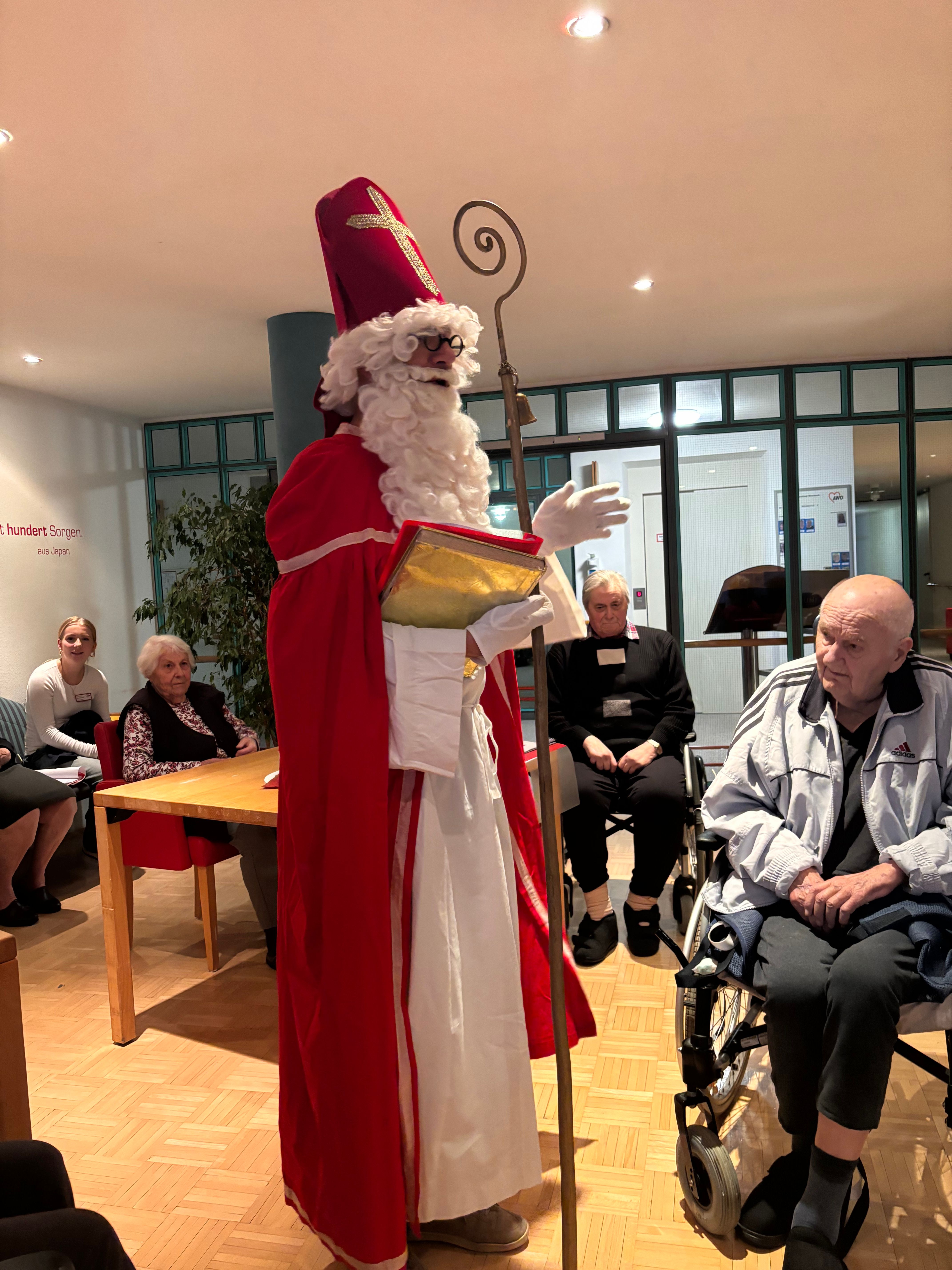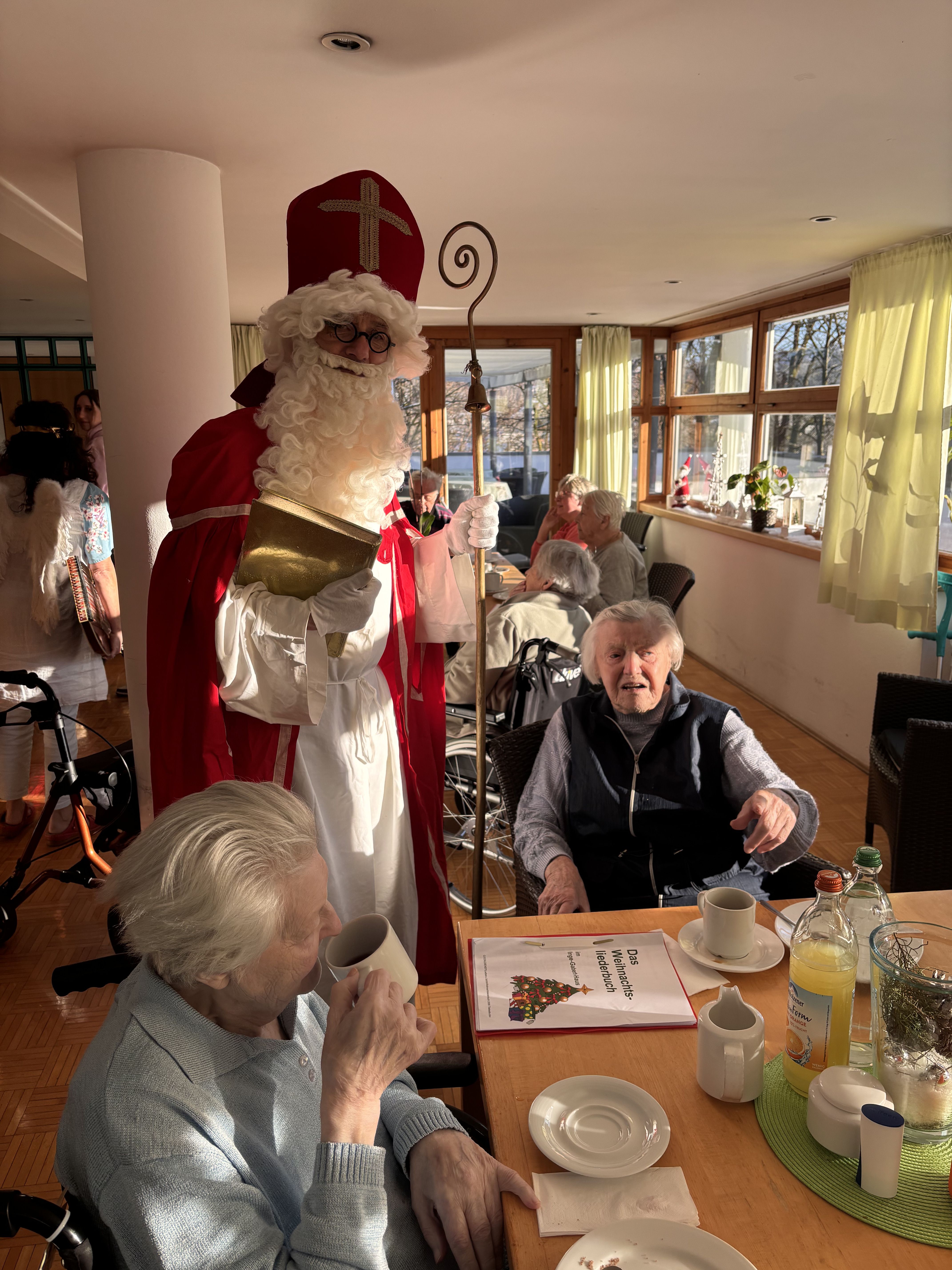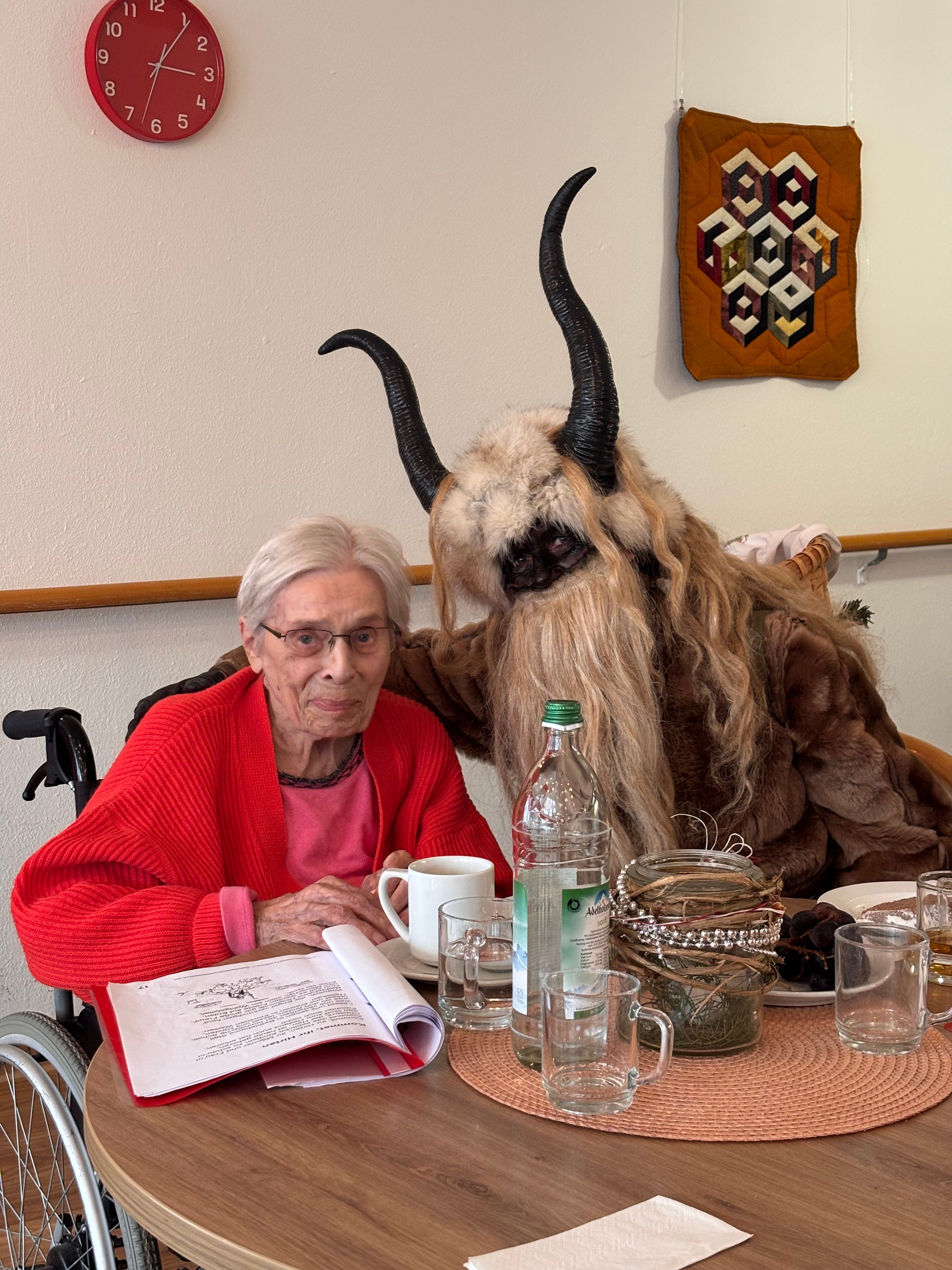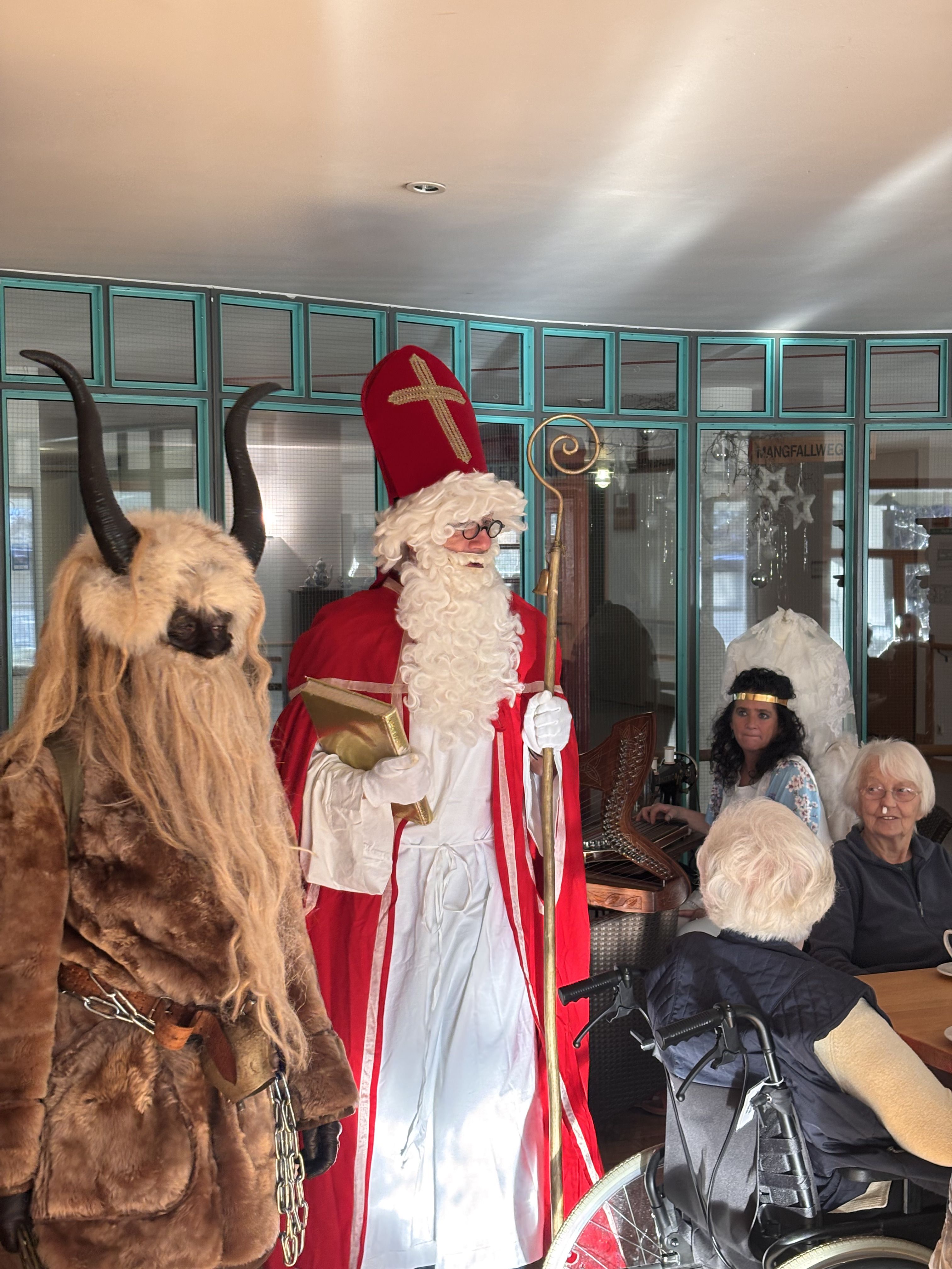 Am Vorabend des Nikolaustages schaute der Heilige Mann, wie im jeden Jahr, im Inge-Gabert-Haus vorbei. Auch in diesem Jahr kam er nicht alleine. Krampus, sein wilder Geselle und ein nicht ganz so braver Engel, der mit der Zither die Weihnachtslieder begleitete, begleitete ihn. Damit die Bewohnerinnen und Bewohner nicht ungeduldig auf das Trio warten mussten, stimmten die Betreuungsassistent*innen und die Praktikantinnen der Fachoberschule auf den einzelnen Wohnbereichen die Seniorinnen und Senioren mit Weihnachtslieder ein. Der Nikolaus kam nicht mit leeren Händen ins Inge-Gabert-Haus. Für alle gab es eine kleine Tüte mit selbstgebackenen Platzerl.