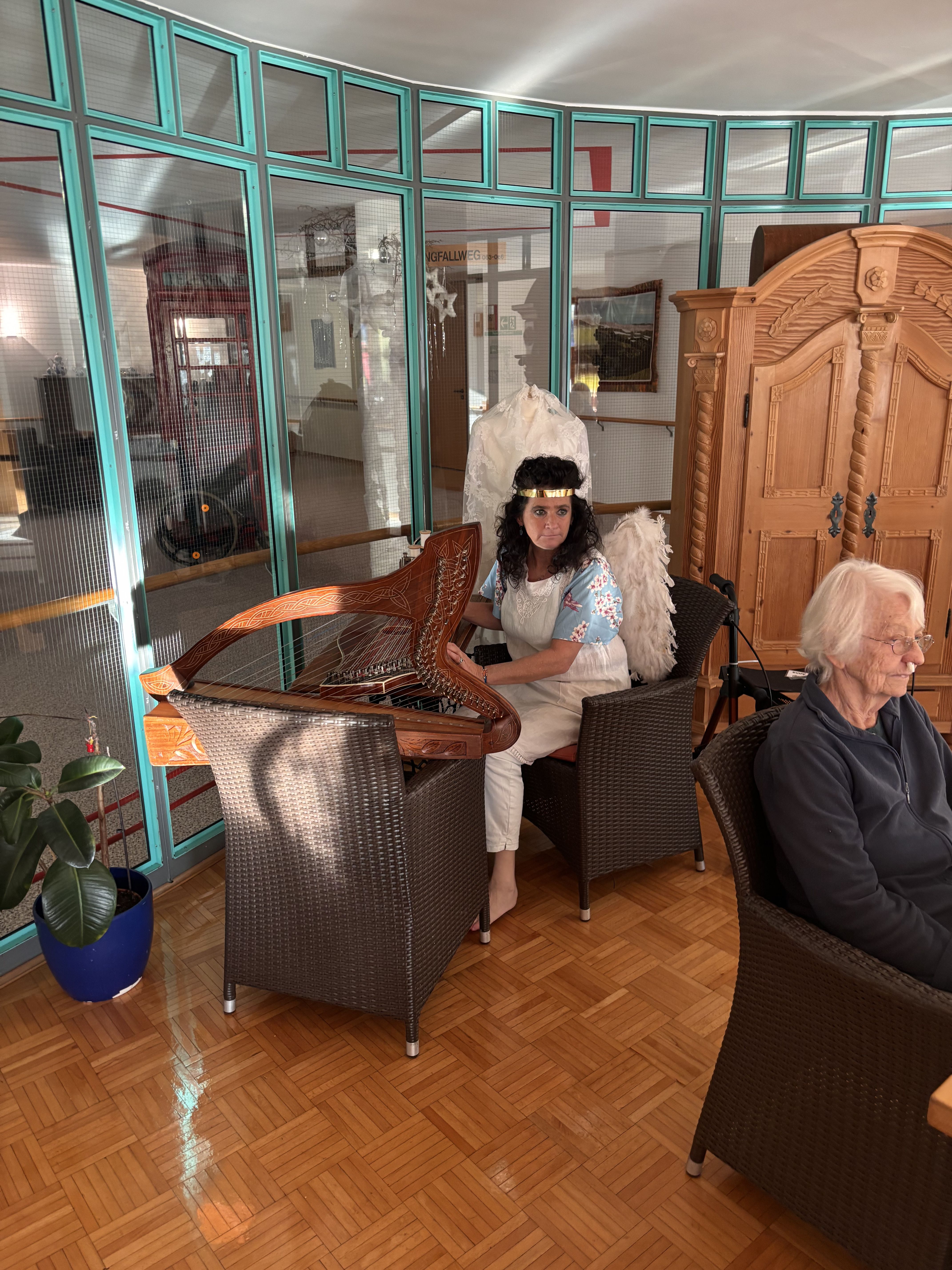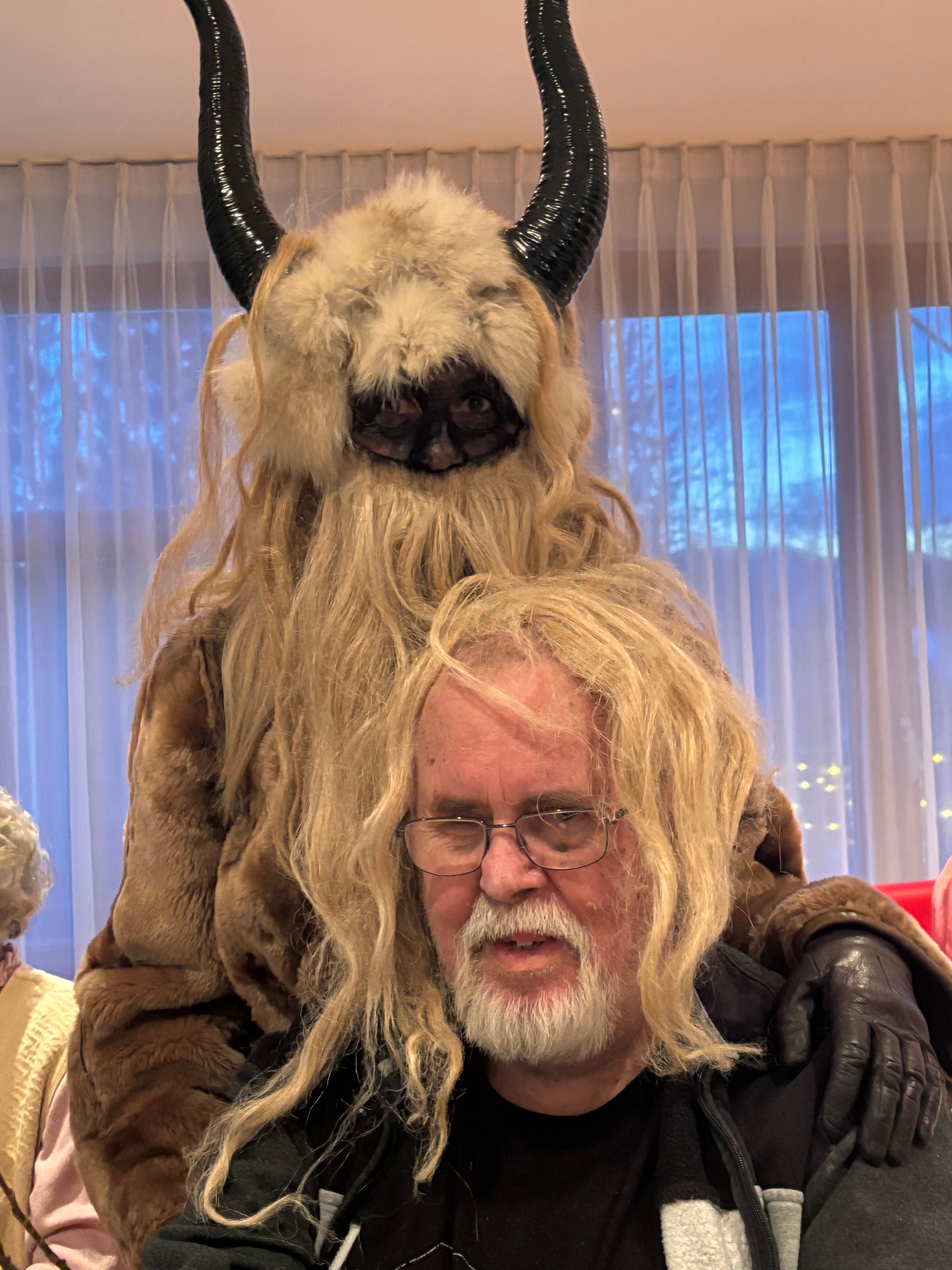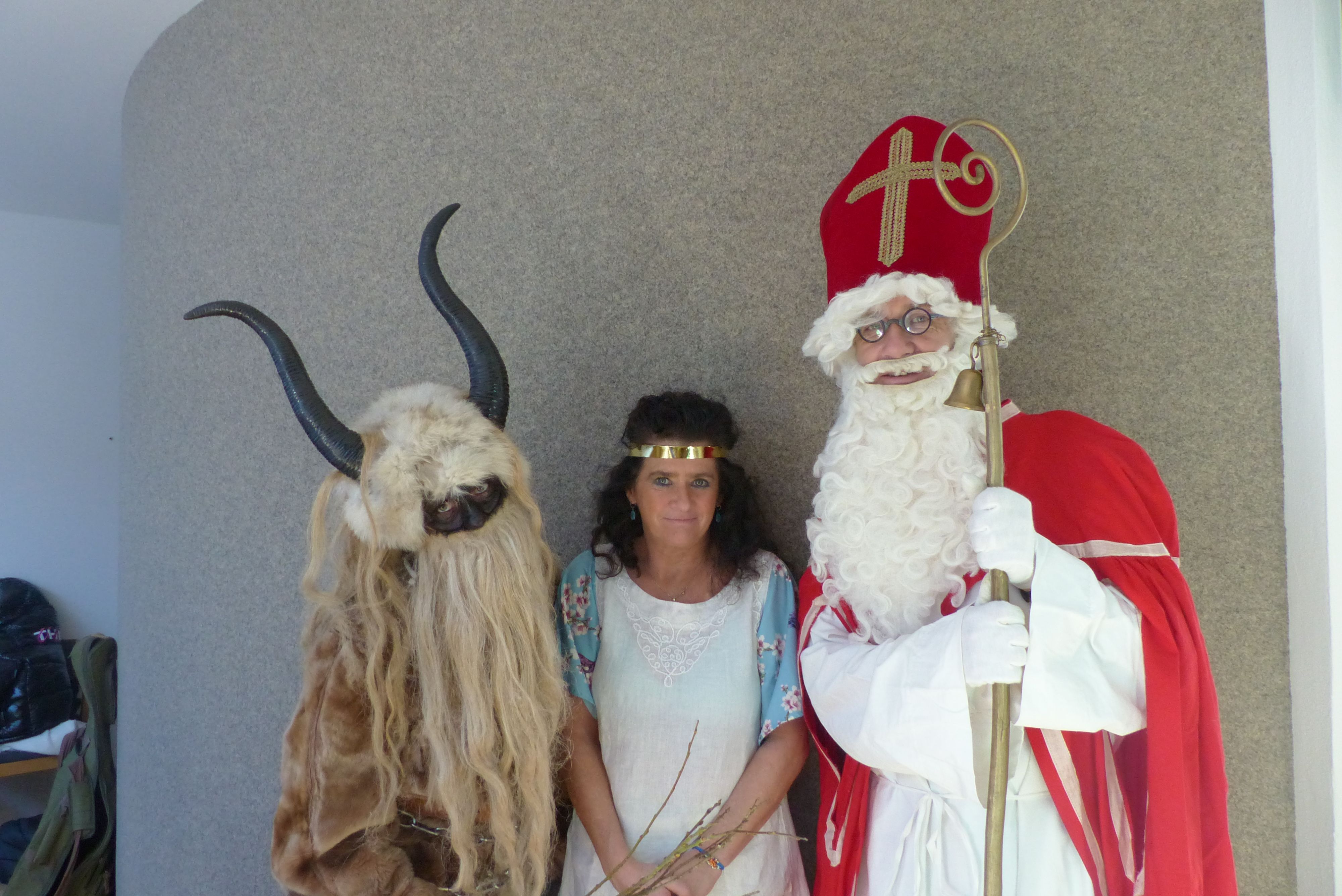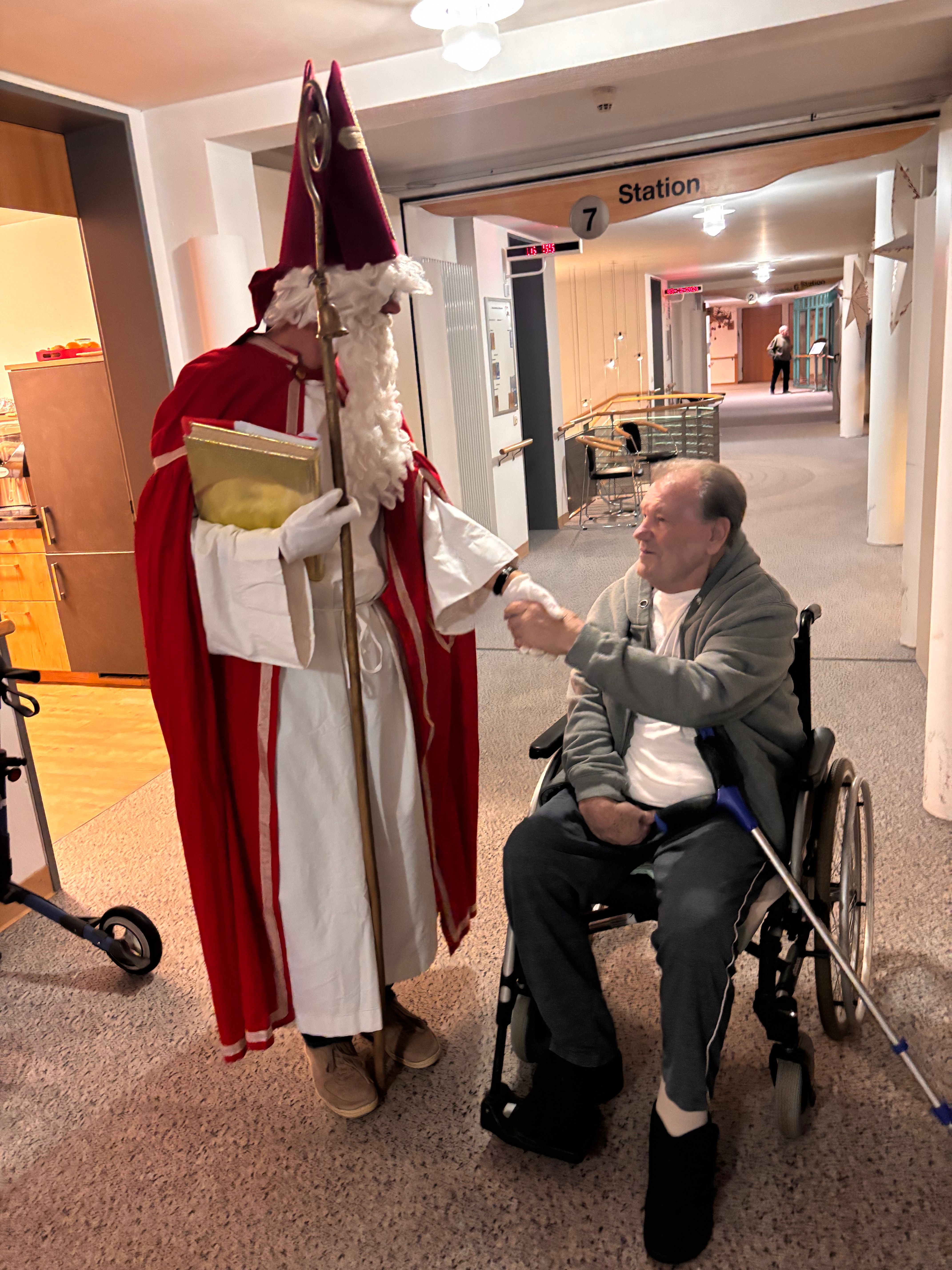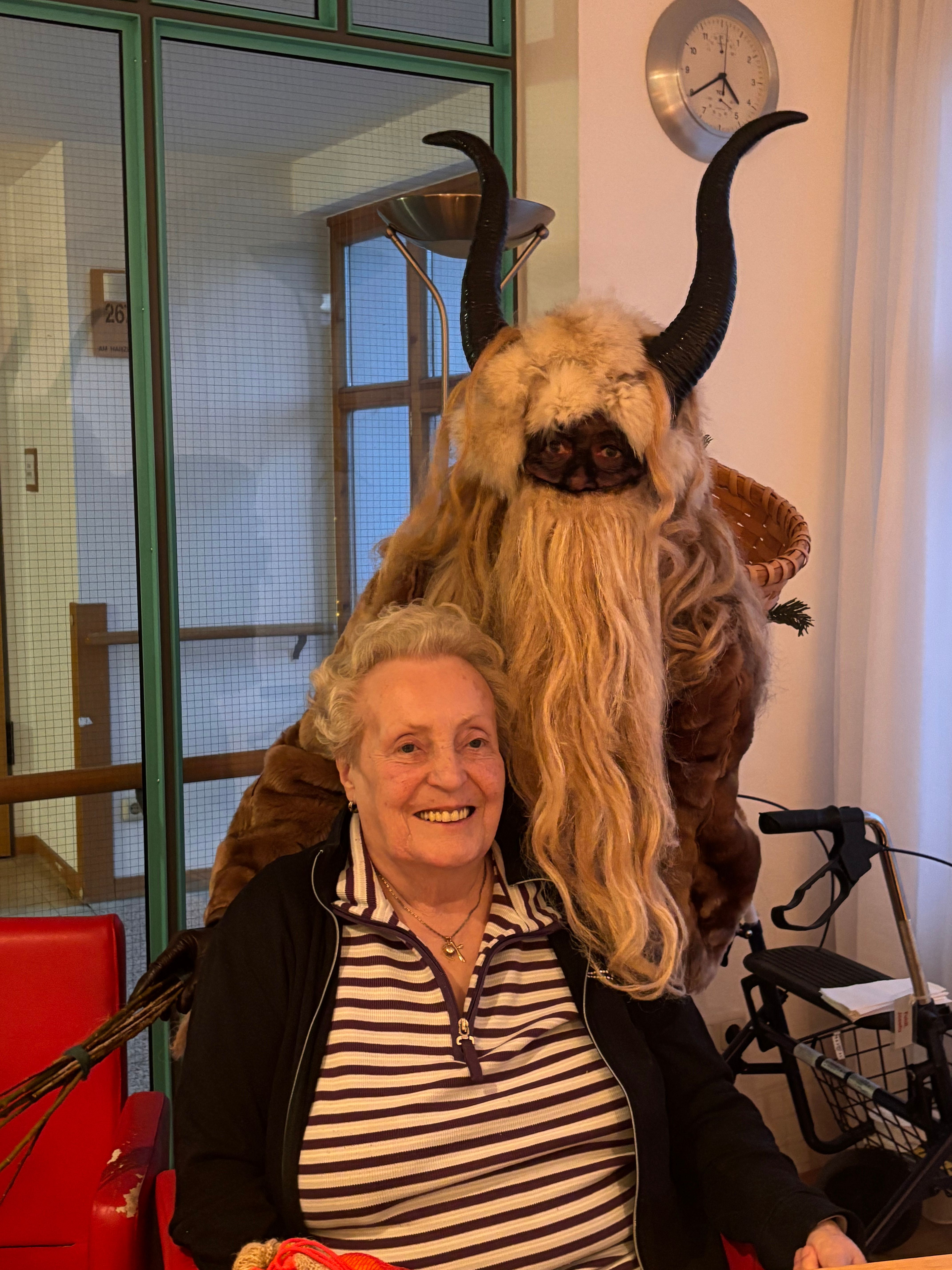 Am Vorabend des Nikolaustages schaute der Heilige Mann, wie im jeden Jahr, im Inge-Gabert-Haus vorbei. Auch in diesem Jahr kam er nicht alleine. Krampus, sein wilder Geselle und ein nicht ganz so braver Engel, der mit der Zither die Weihnachtslieder begleitete, begleitete ihn. Damit die Bewohnerinnen und Bewohner nicht ungeduldig auf das Trio warten mussten, stimmten die Betreuungsassistent*innen und die Praktikantinnen der Fachoberschule auf den einzelnen Wohnbereichen die Seniorinnen und Senioren mit Weihnachtslieder ein. Der Nikolaus kam nicht mit leeren Händen ins Inge-Gabert-Haus. Für alle gab es eine kleine Tüte mit selbstgebackenen Platzerl.
