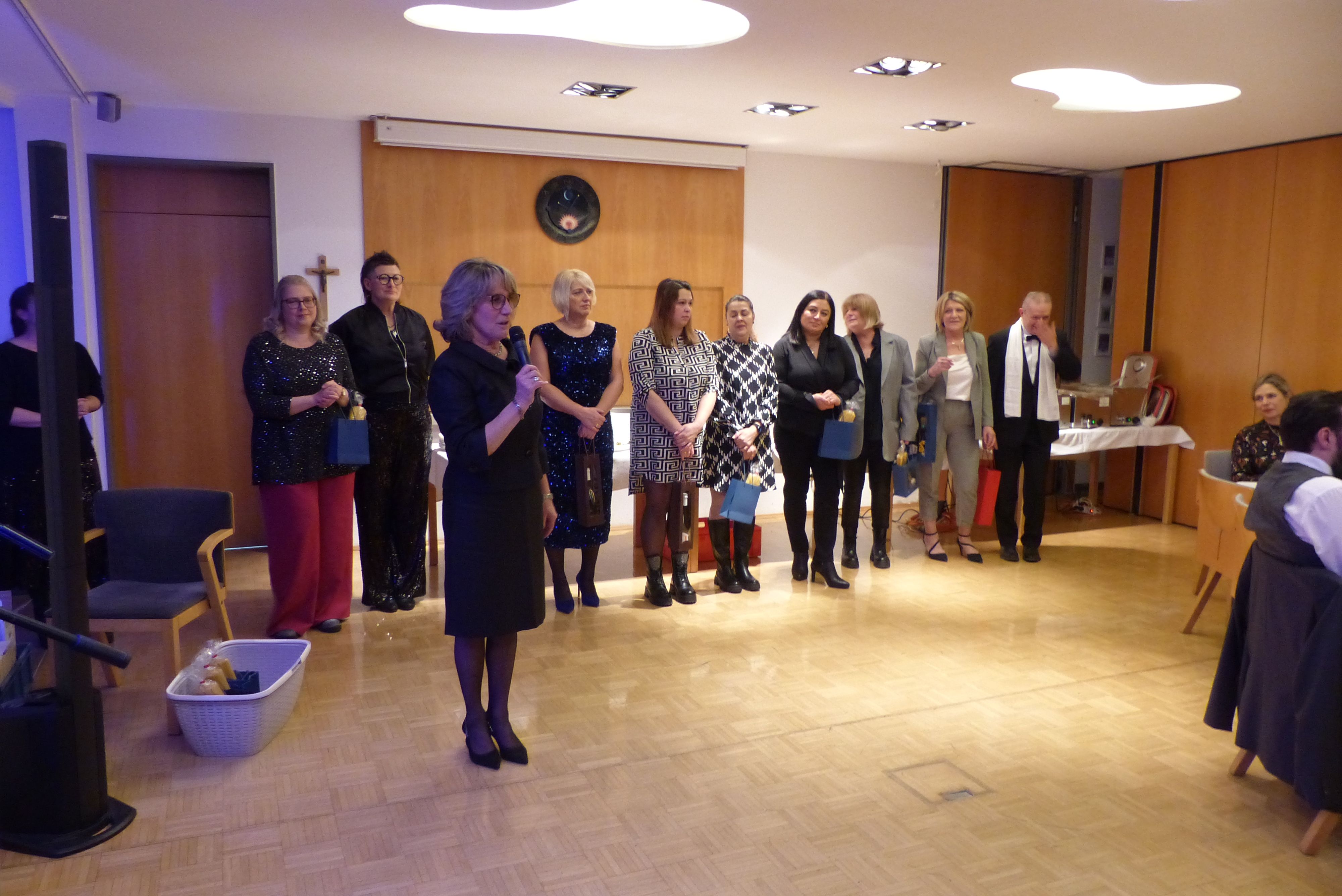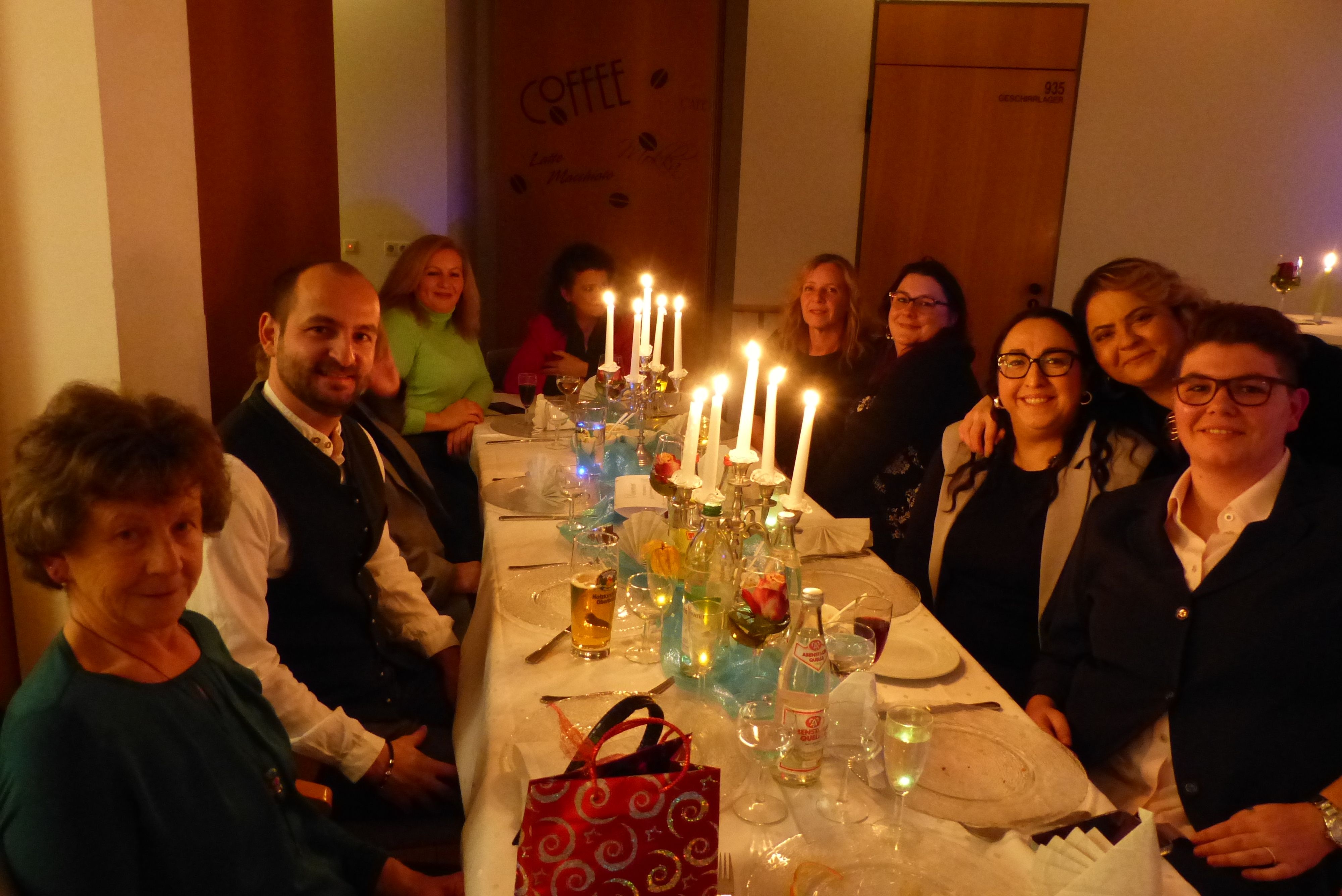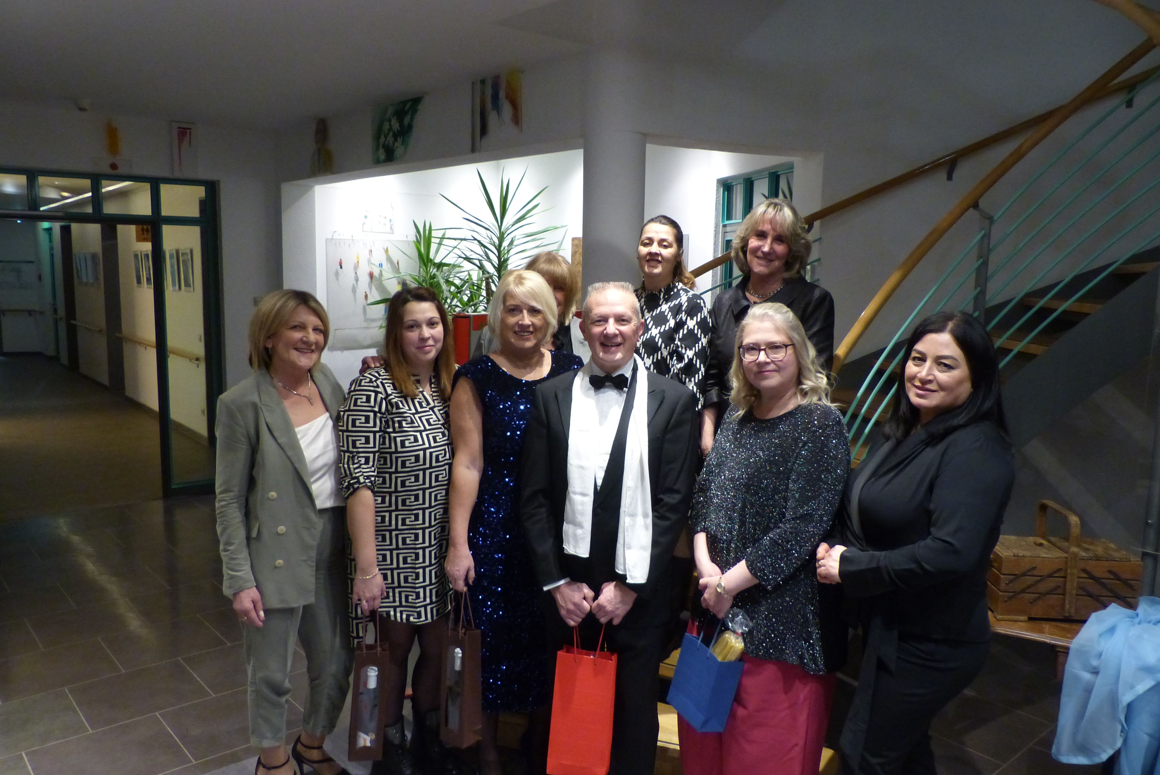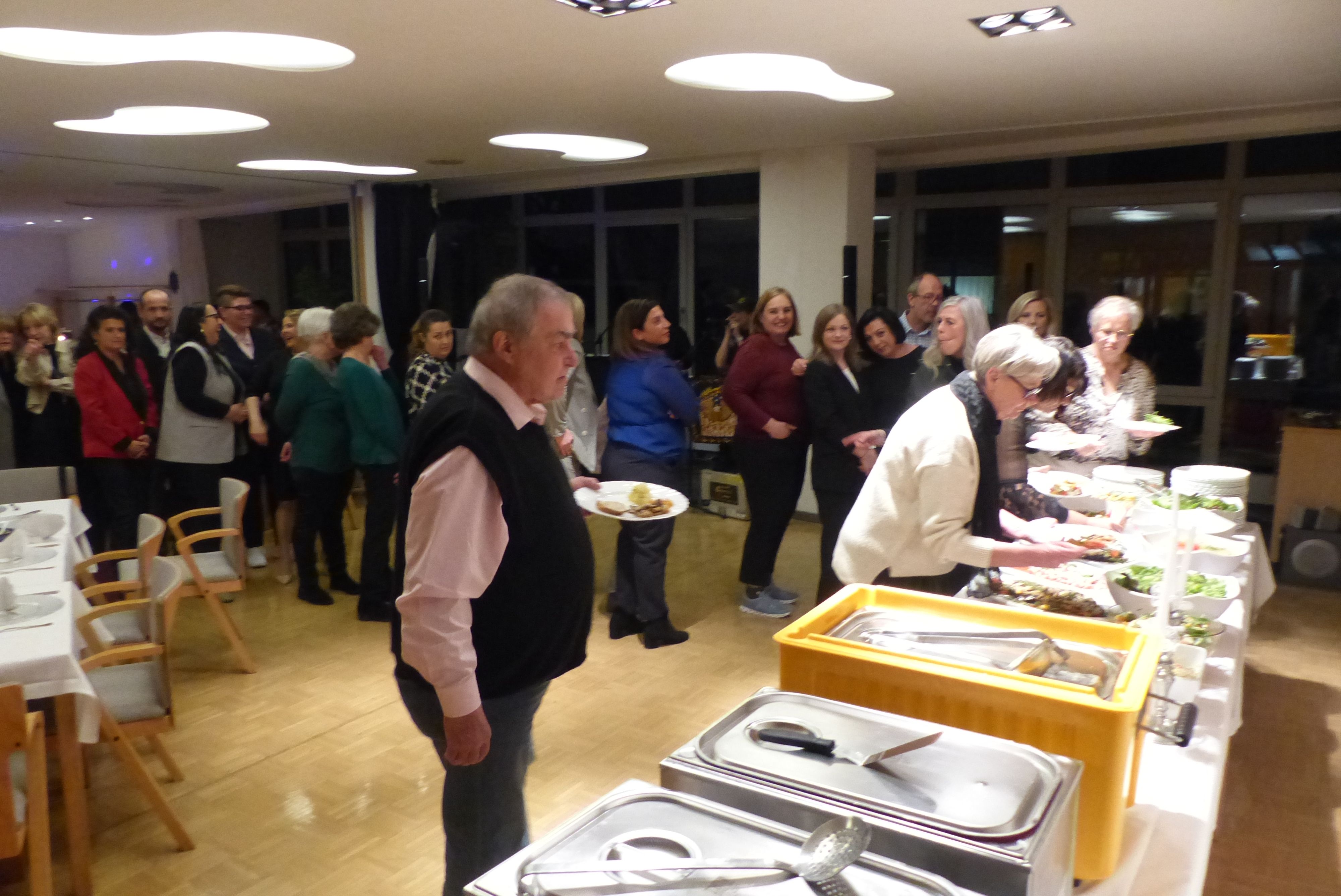 Im Dezember feiern wir gemeinsam mit den Bewohner*innen des Hauses ein großes Weihnachtsfest im Terofalsaal. Im Januar lädt Einrichtungsleitung Rosi Holzapfel ihre Mitarbeiterinnen und Mitarbeiter traditionell zum Neujahrsempfang ein. Seit langem fand dieses beliebte Mitarbeiterfest mal wieder im hauseigenen Terofalsaal statt. Schon zwei Tage vor der eigentlichen Feier scharten sich wieder einige Kolleg*innen um Rosi Holzapfel um gemeinsam den Saal einzudecken und festlich zu dekorieren. Ein Caterer brachte am Abend das Buffet vorbei, so dass das Küchenteam auch unbeschwert mitfeiern konnte und für die Stimmung sorgten Christel und Roland mit ihrer Band. Rosi Holzapfel ließ es sich auch heuer nicht nehmen verdiente und langjähre Kolleginnen und Kollegen zu ehren. Für 10 Jahre wurden geehrt: Elke Biewer, Daniela Dietl, Melissa Messina. Für 15 Jahre: Saadet Ay, Mary Di Bella und Swetlana Legejdo. Bereits 20 Jahre: Melanie Eder und für 25 Jahre: Marija Bubnjaric,Seife Dagistan und Bettina Polixa. Und sage und schreibe 30 Jahre im Inge-Gabert-Haus ist bereits Gabor Santo