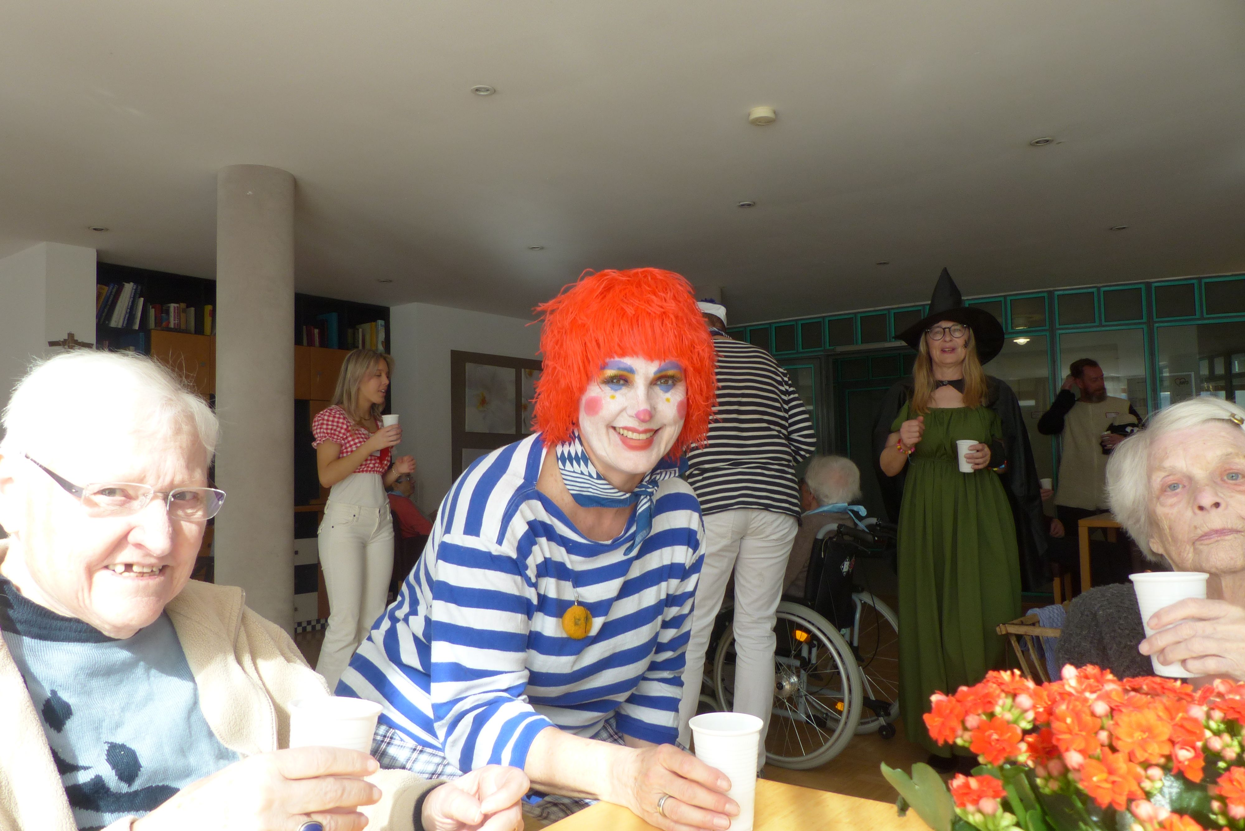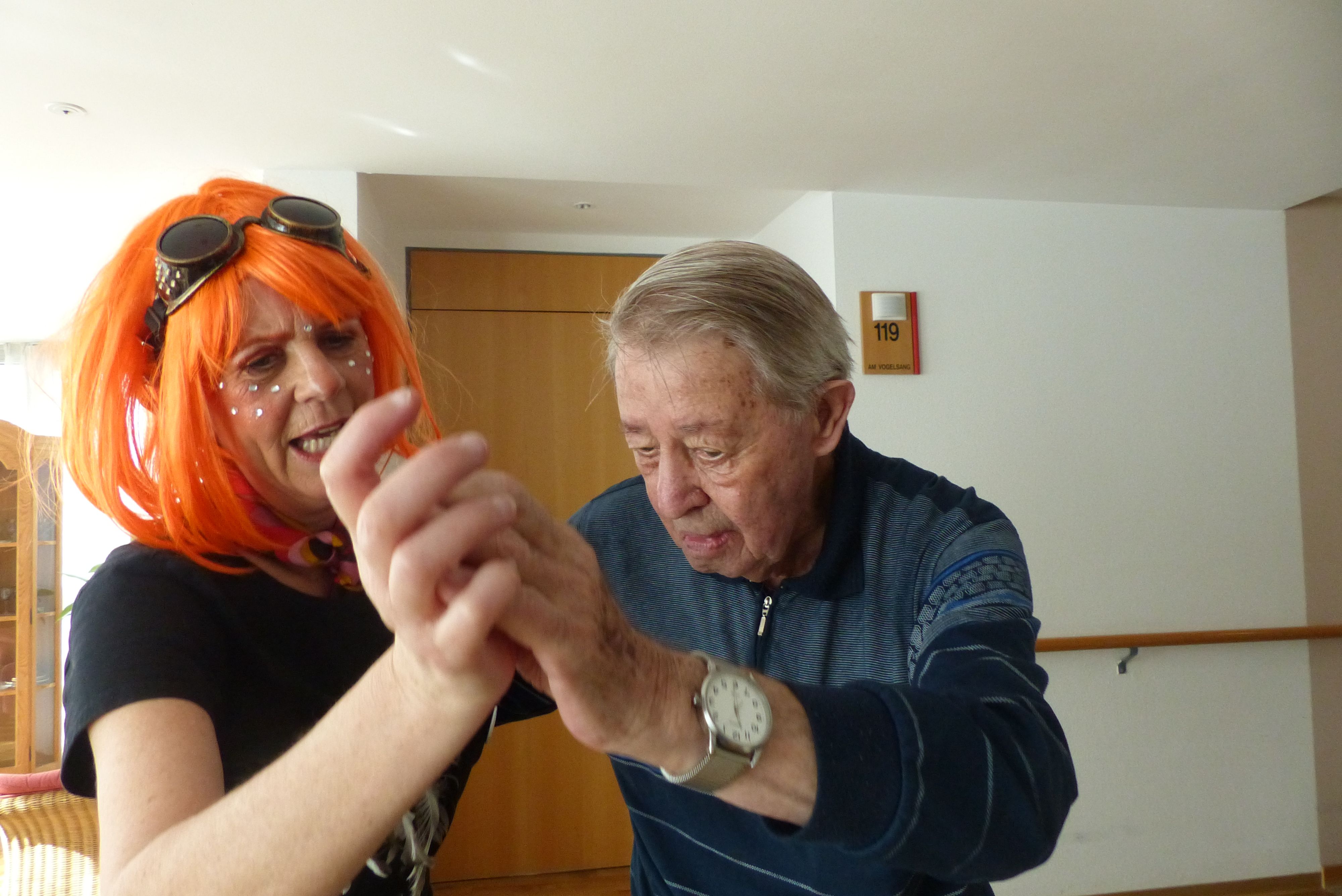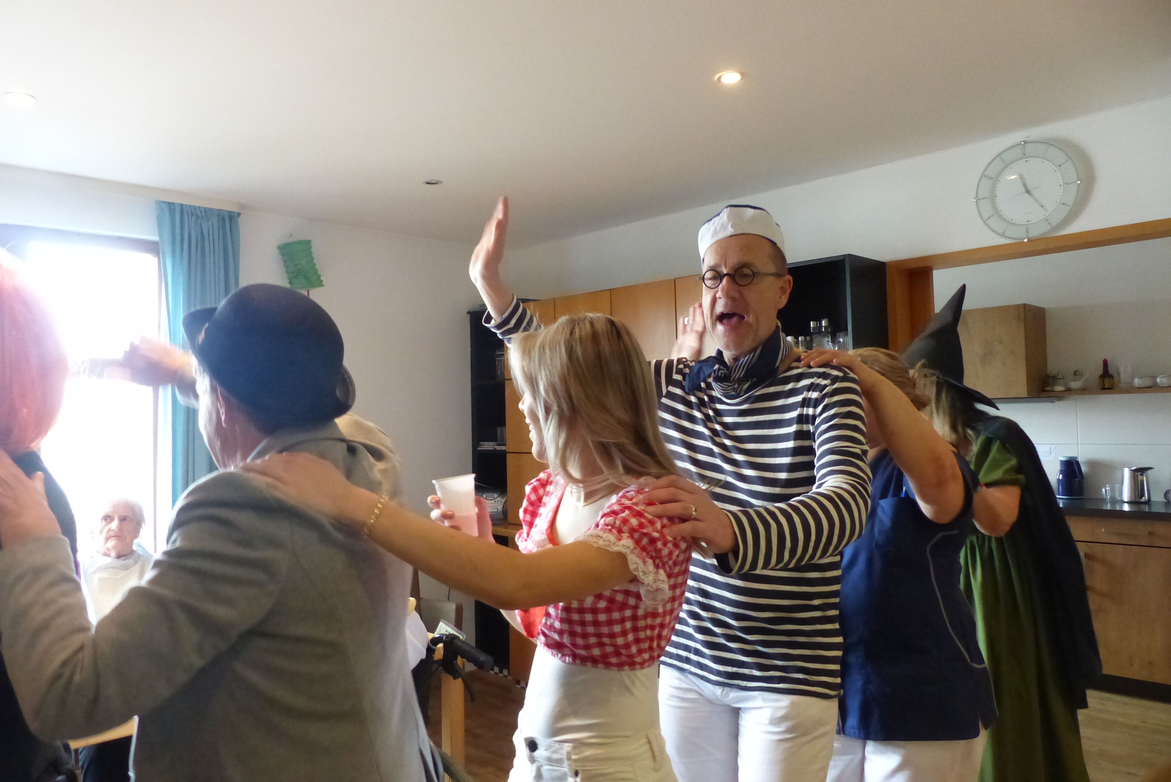Wer am „unsinnigen Donnerstag“ noch nicht genug hatte, konnte am „rußigen Freitag“ gleich da weitermachen, wo er am Tag davor aufgehört hatte.Die Mitarbeiterinnen und Mitarbeiter des Sozialdienstes zogen am späten Vormittag gerüstet mit einem alten Leiterwagen von Wohnbereich zu Wohnbereich und tanzten sich so durchs ganze Haus. Mit auf dem Leiterwagen hatten sie die passende Musik die überall für Stimmung sorgte und spritzigen Prosecco, der auch den letzten Faschingsmuffel zum Feiern brachte.