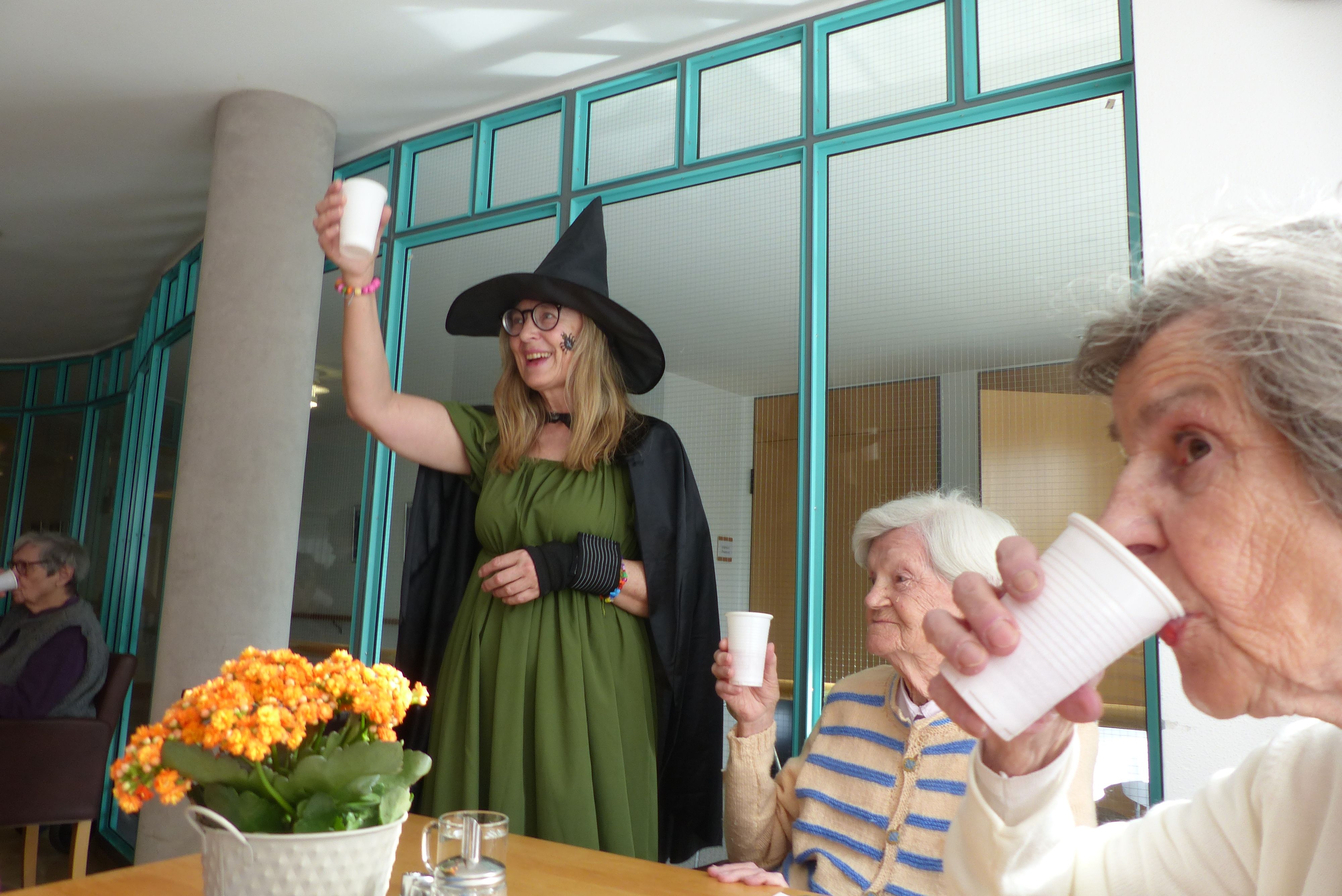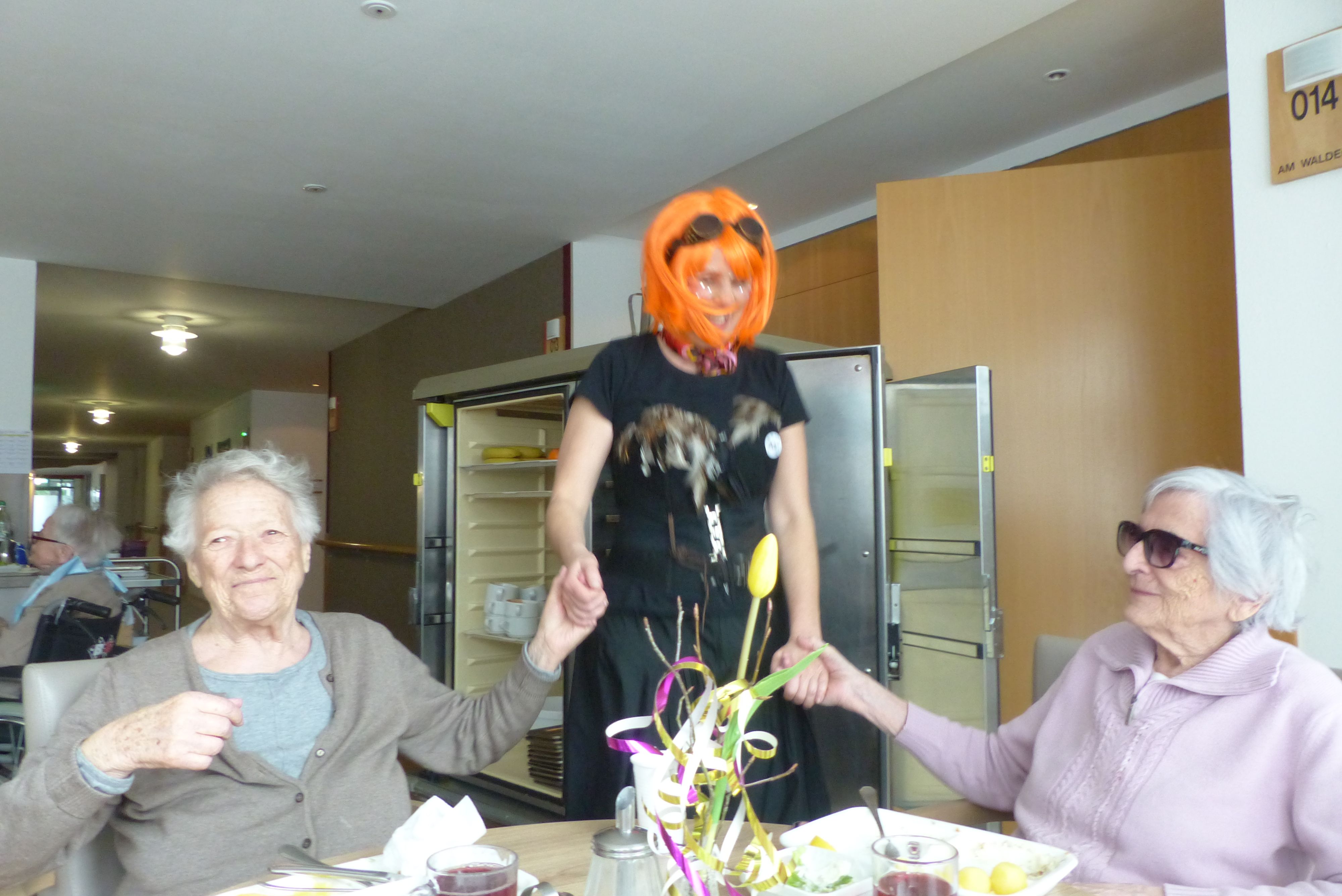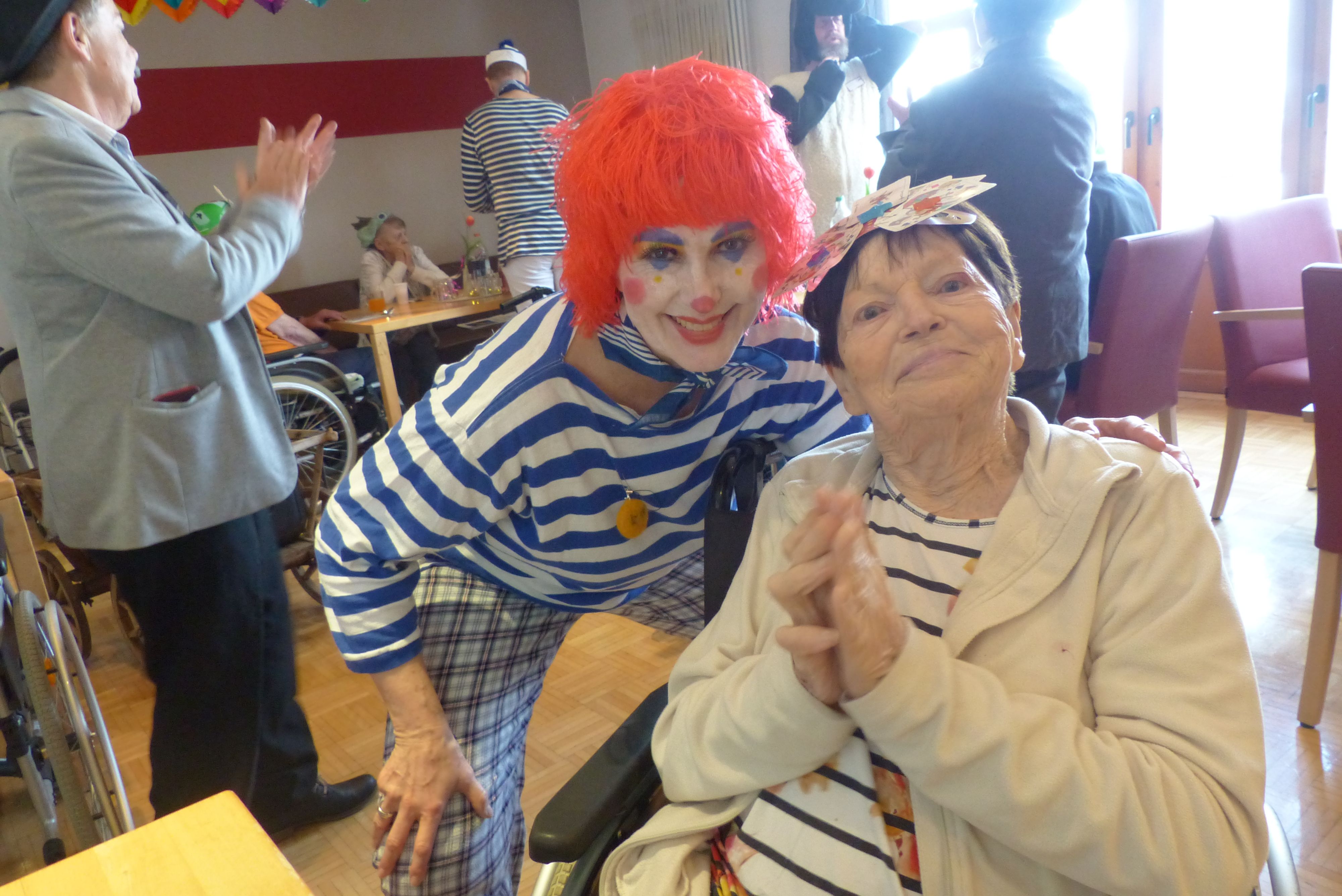 Wer am „unsinnigen Donnerstag“ noch nicht genug hatte, konnte am „rußigen Freitag“ gleich da weitermachen, wo er am Tag davor aufgehört hatte.Die Mitarbeiterinnen und Mitarbeiter des Sozialdienstes zogen am späten Vormittag gerüstet mit einem alten Leiterwagen von Wohnbereich zu Wohnbereich und tanzten sich so durchs ganze Haus. Mit auf dem Leiterwagen hatten sie die passende Musik die überall für Stimmung sorgte und spritzigen Prosecco, der auch den letzten Faschingsmuffel zum Feiern brachte.