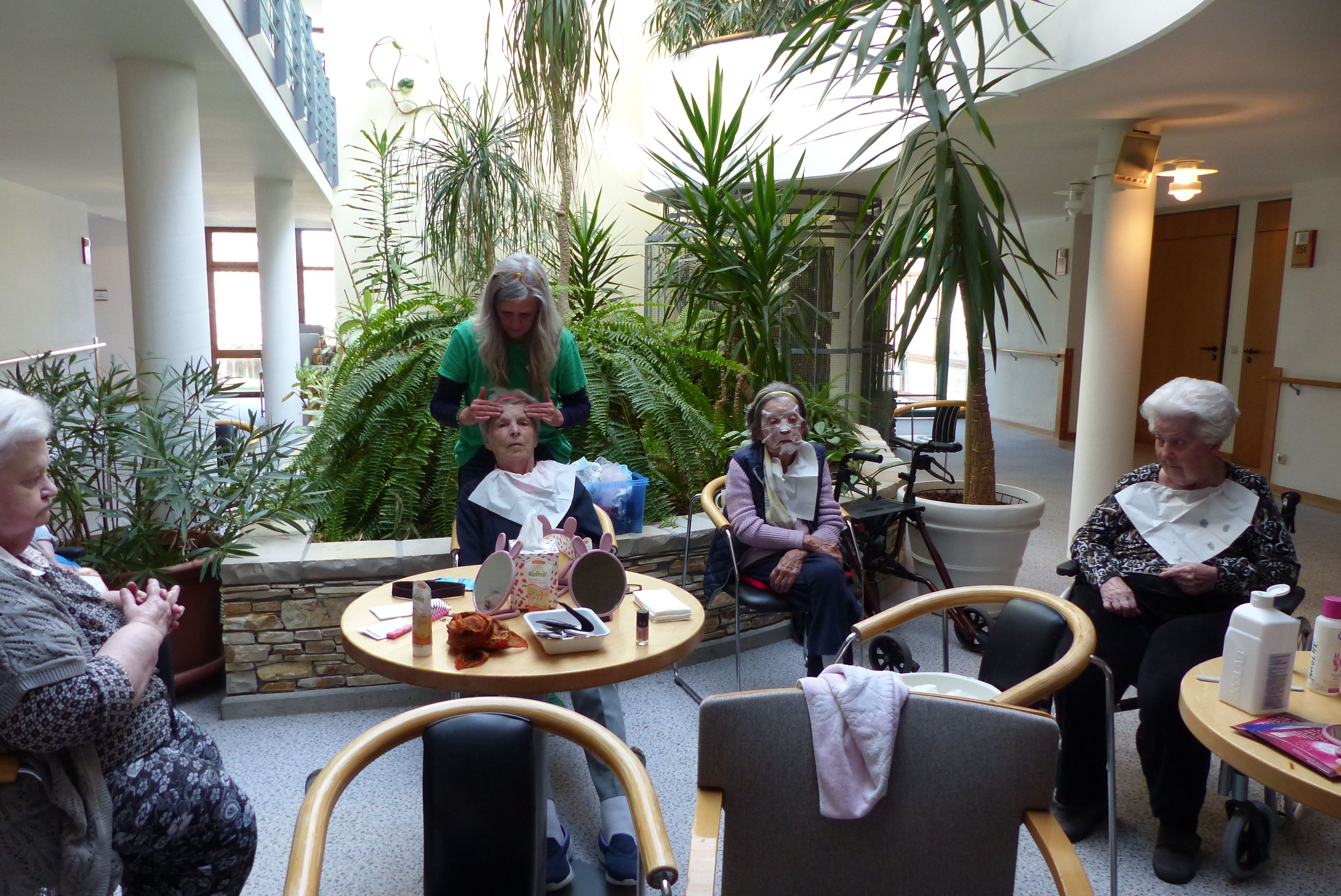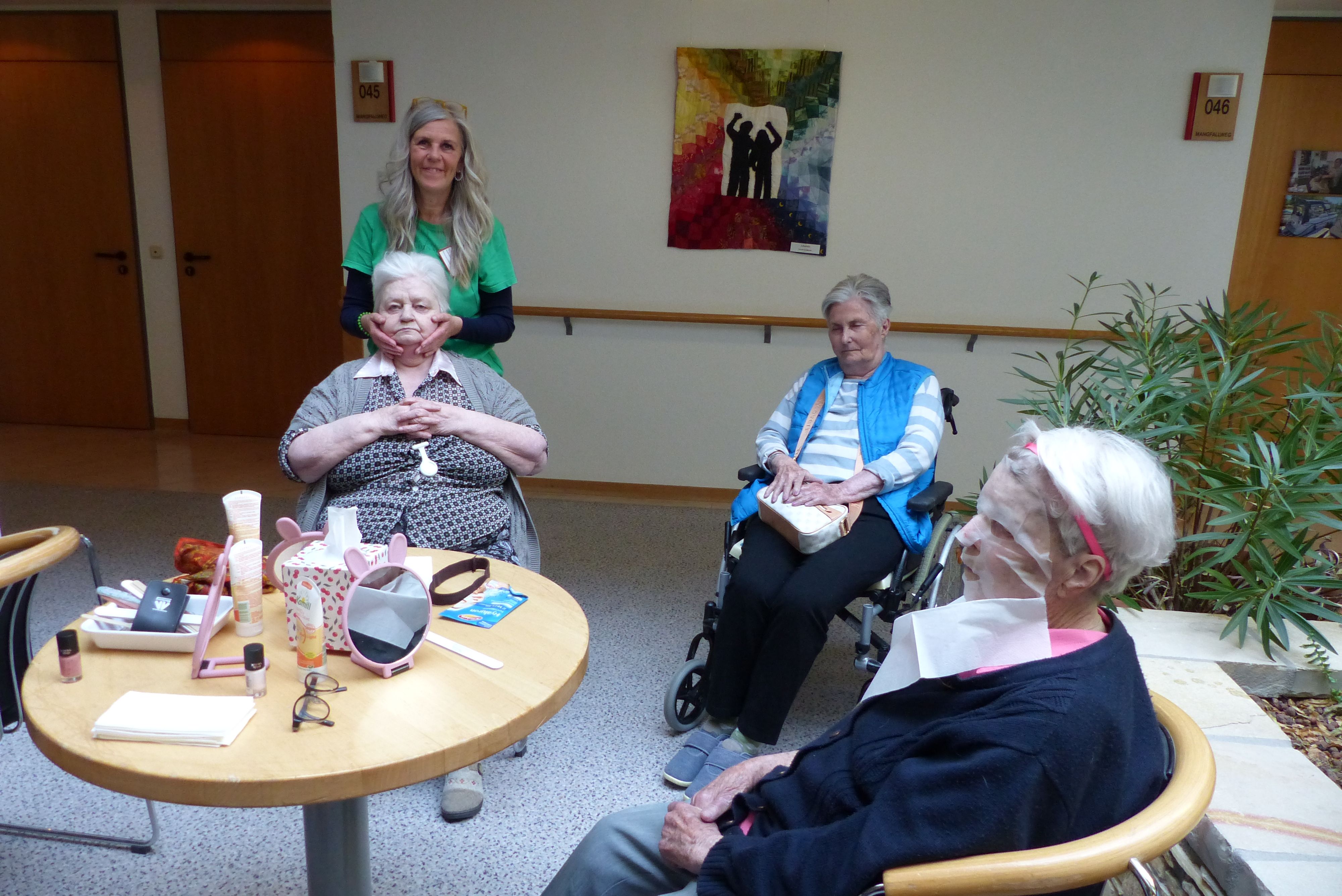 Sandra Ebner und Ingeborg Fellerer vom Sozialdienst dachten sich für den Freitag, den 11. April ein besonderes Angebot aus. Während die einen Senior*innen zur Sitzgymnastik oder zum Boccia-Spielen gingen, luden die beiden Betreuungsassistentinnen in den Beautysalon ein. Entspannt und glücklich verließen die acht Seniorinnen nach einer Stunde die Wellnessoase auf dem Wohnbereich 2.