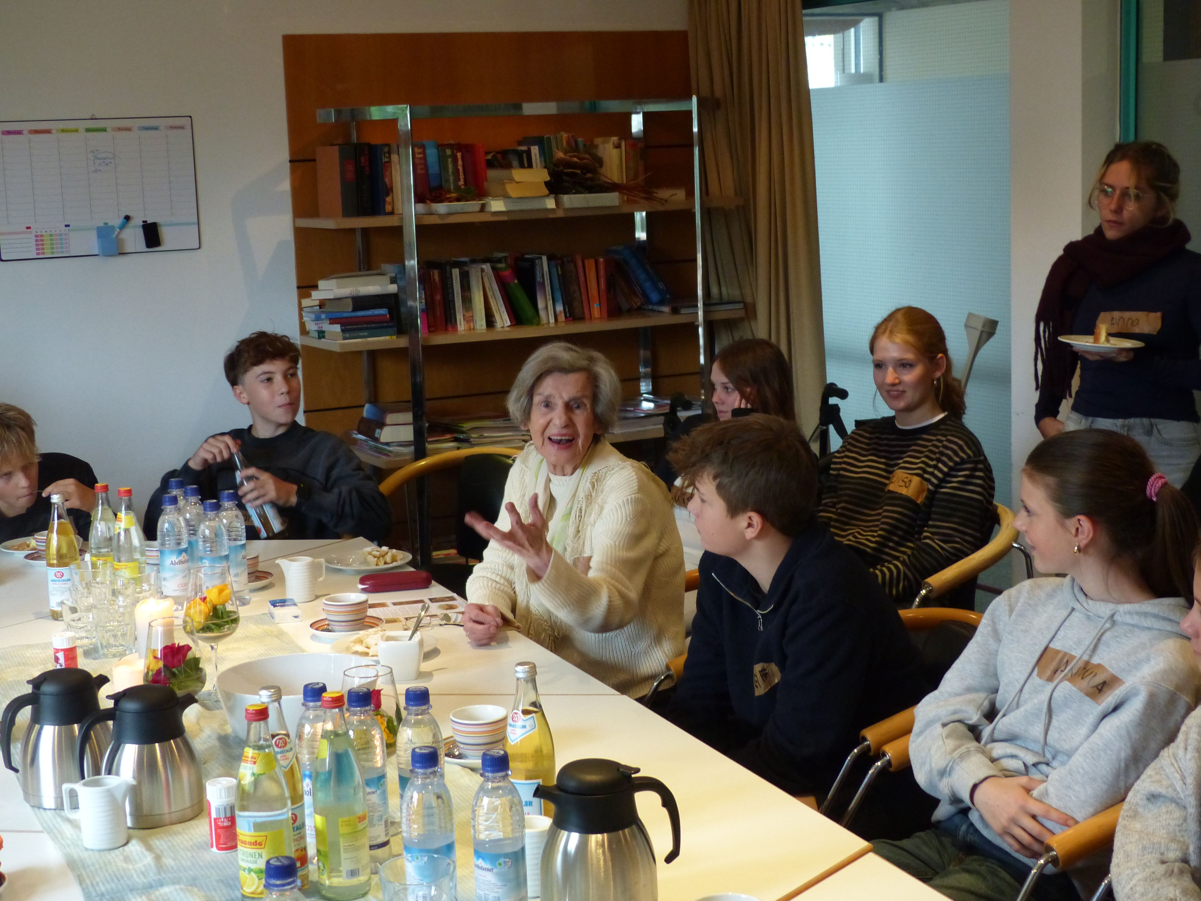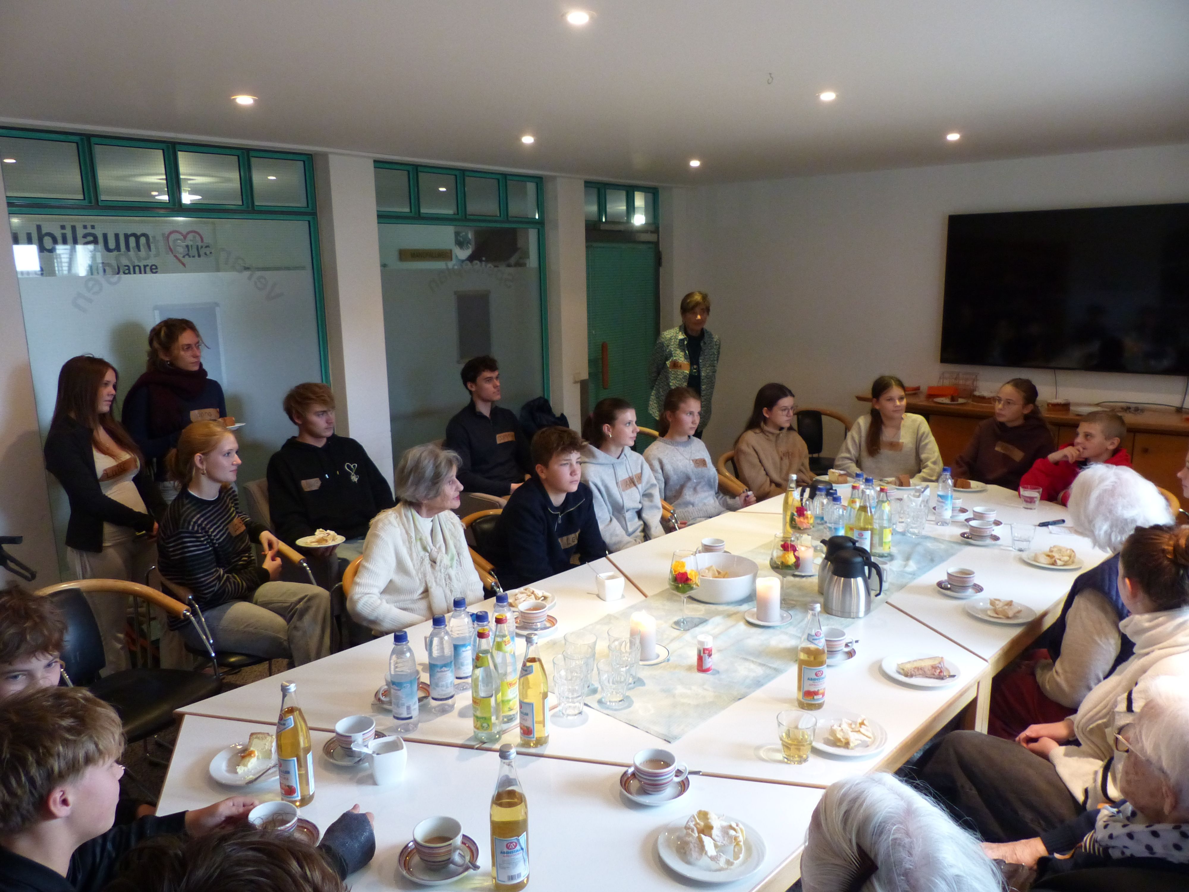 Im Rahmen ihres Konfirmandenunterrichts besuchten uns am Freitag, den 17. Oktober 12 Konfirmandinnen und Konfirmanden gemeinsam mit ihren Gruppenleitern und der Pfarrerin Anika Sergel-Kohls das Inge-Gabert-Haus. Bei einer gemeinsamen Kaffeerunde mit einigen Seniorinnen kamen die Jugendlichen mit den Hausbewohnerinnen in Kontakt. Claudia Behrend lass an der Kaffeetafel den Sonnengesang von Franz von Assisi vor, der danach zu angeregten Gesprächen beitrug. Anschließend schwärmten die Konfirmand*innen im ganzen Haus aus. Halfen den Bewohner*innen in die Kapelle zu kommen, wo sie den Gottesdienst mitgestalteten.