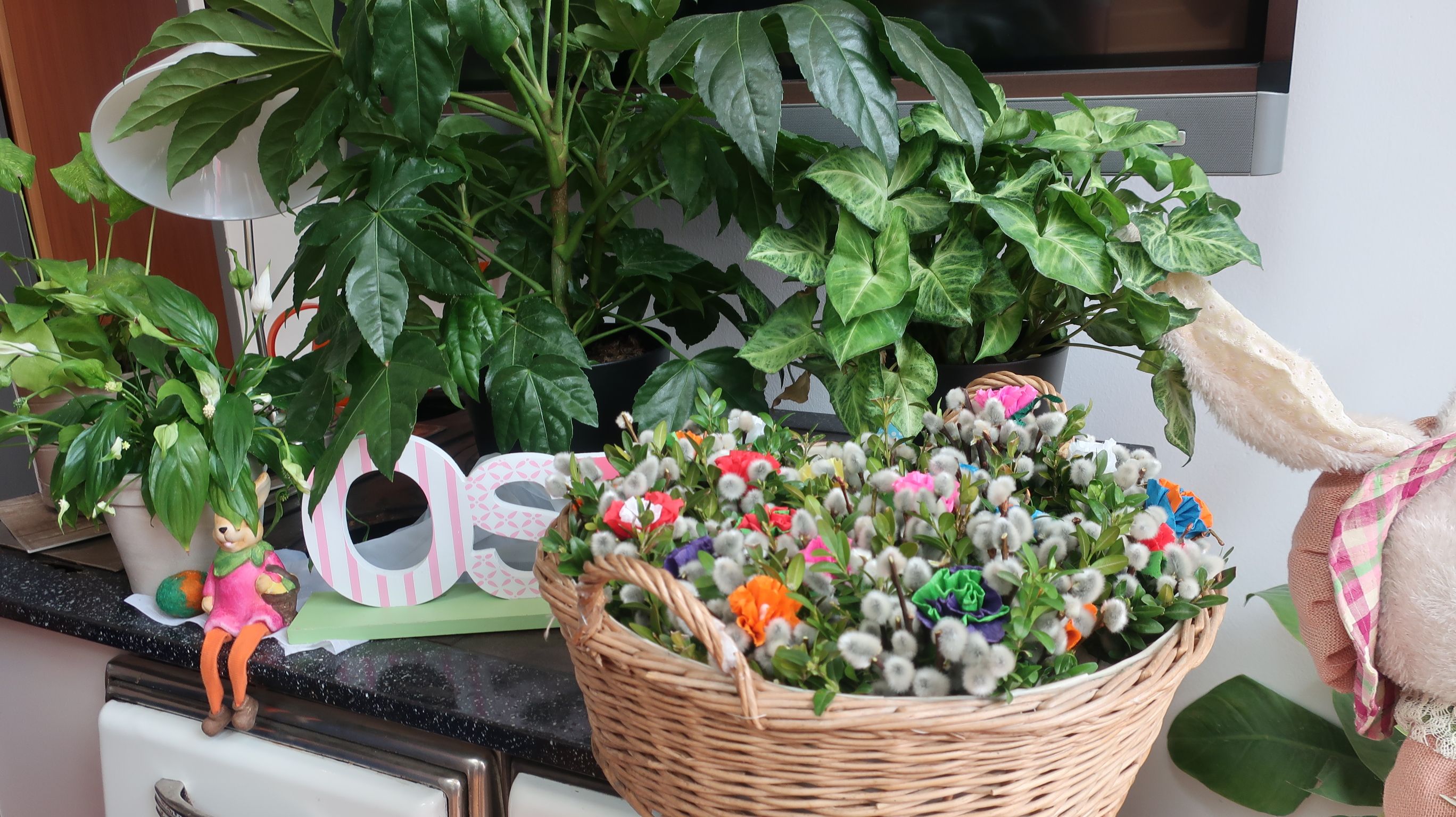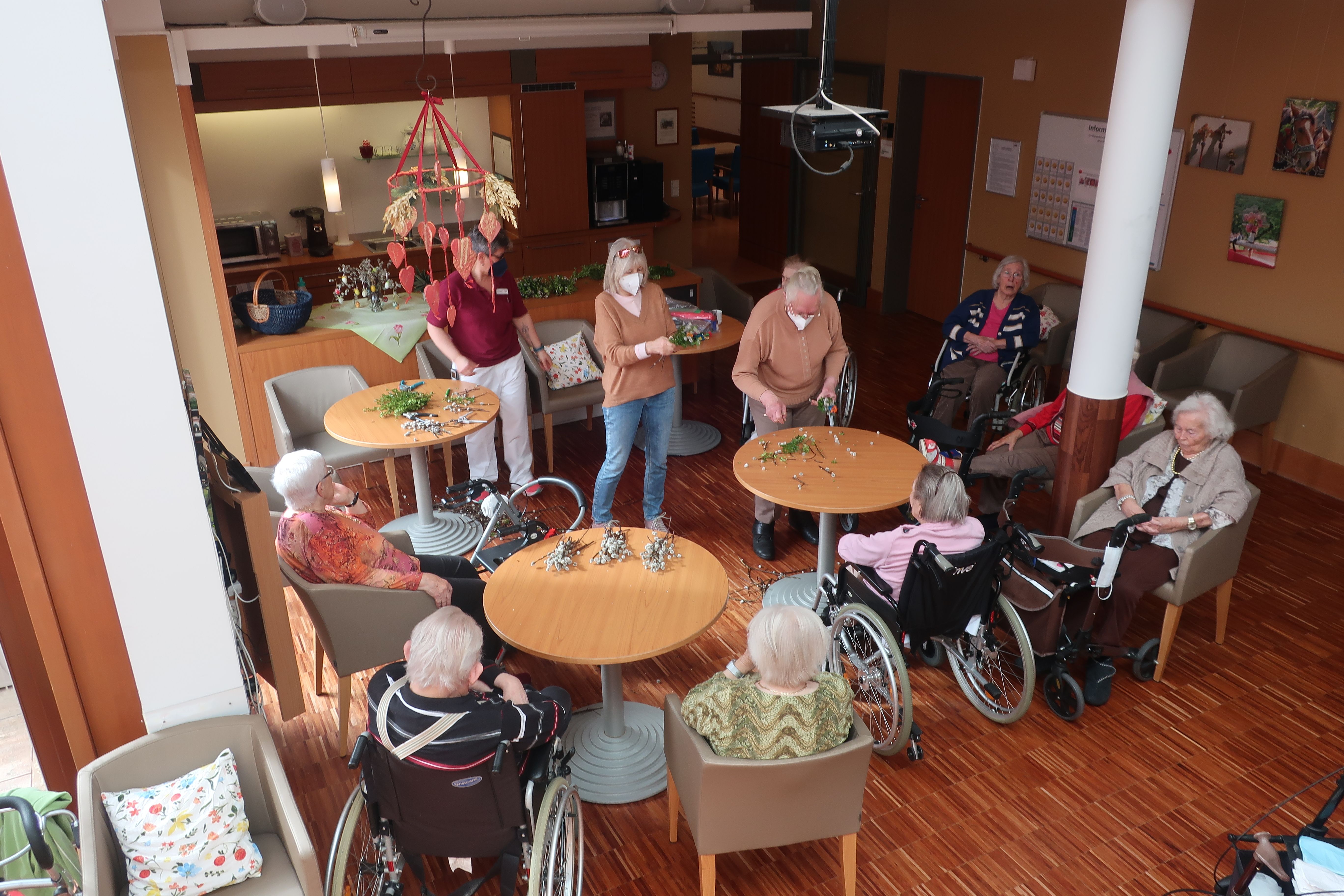 Das gestalterische Miteinander war dieses Mal in der Cafeteria. So entstanden herrliche Palmbüschel (Weidenkätzchen mit Buchs und Krepppapierblumen), die anschließend von Frau Singer zur Weihung am Palmsonntag mit in die Kirche genommen werden. Später wird der österliche Schmuck an die Bewohner*innen verteilt.