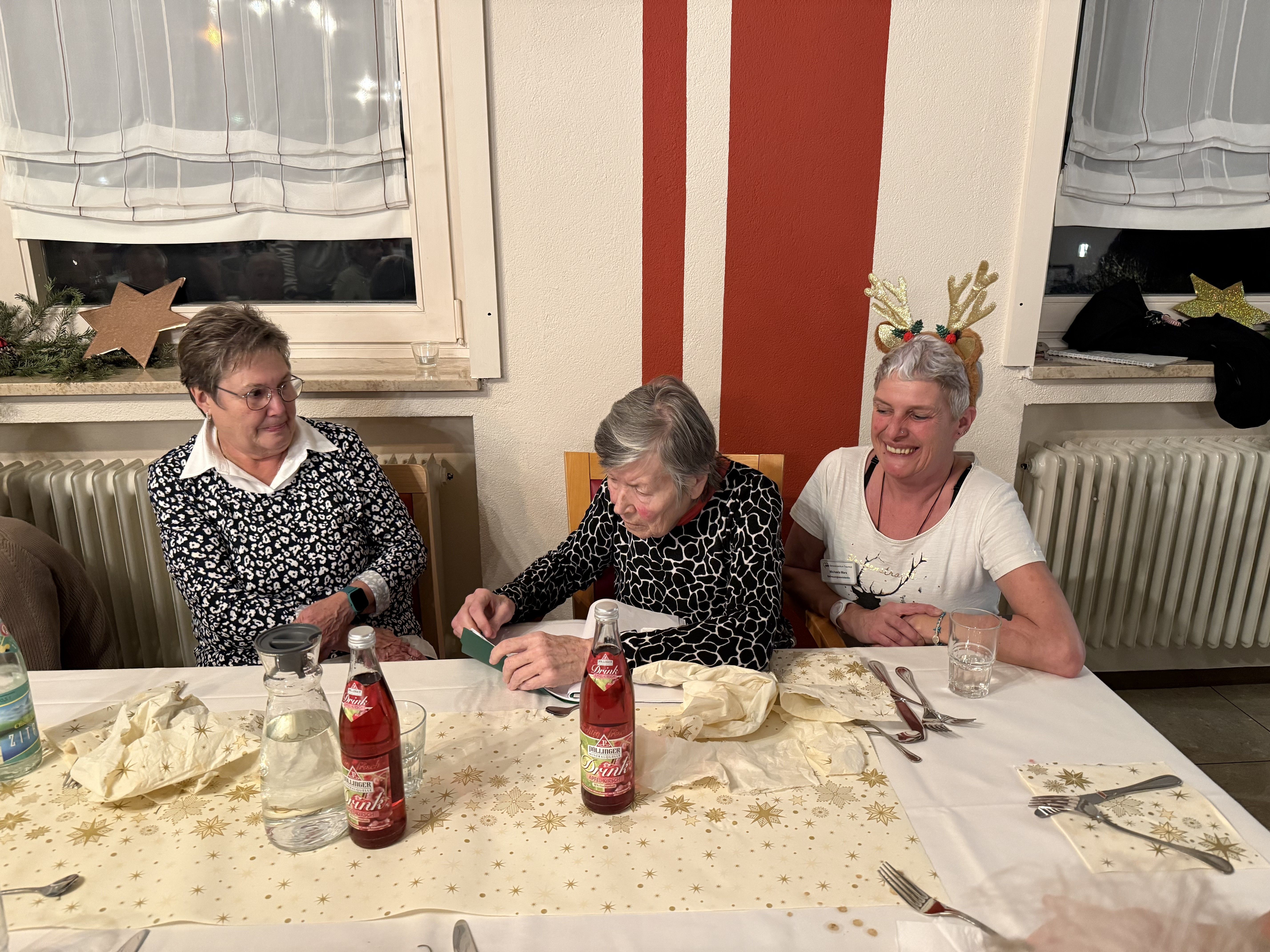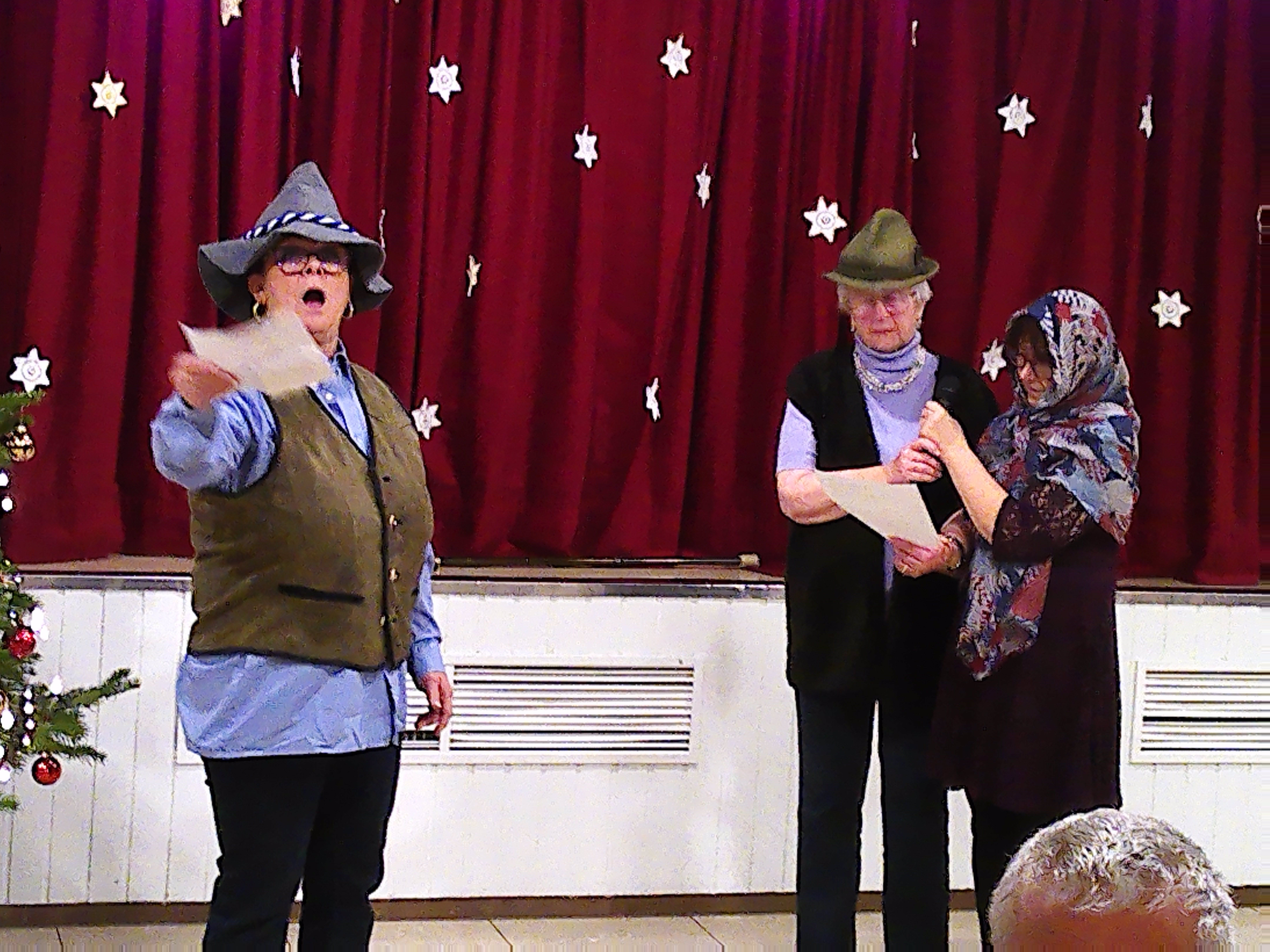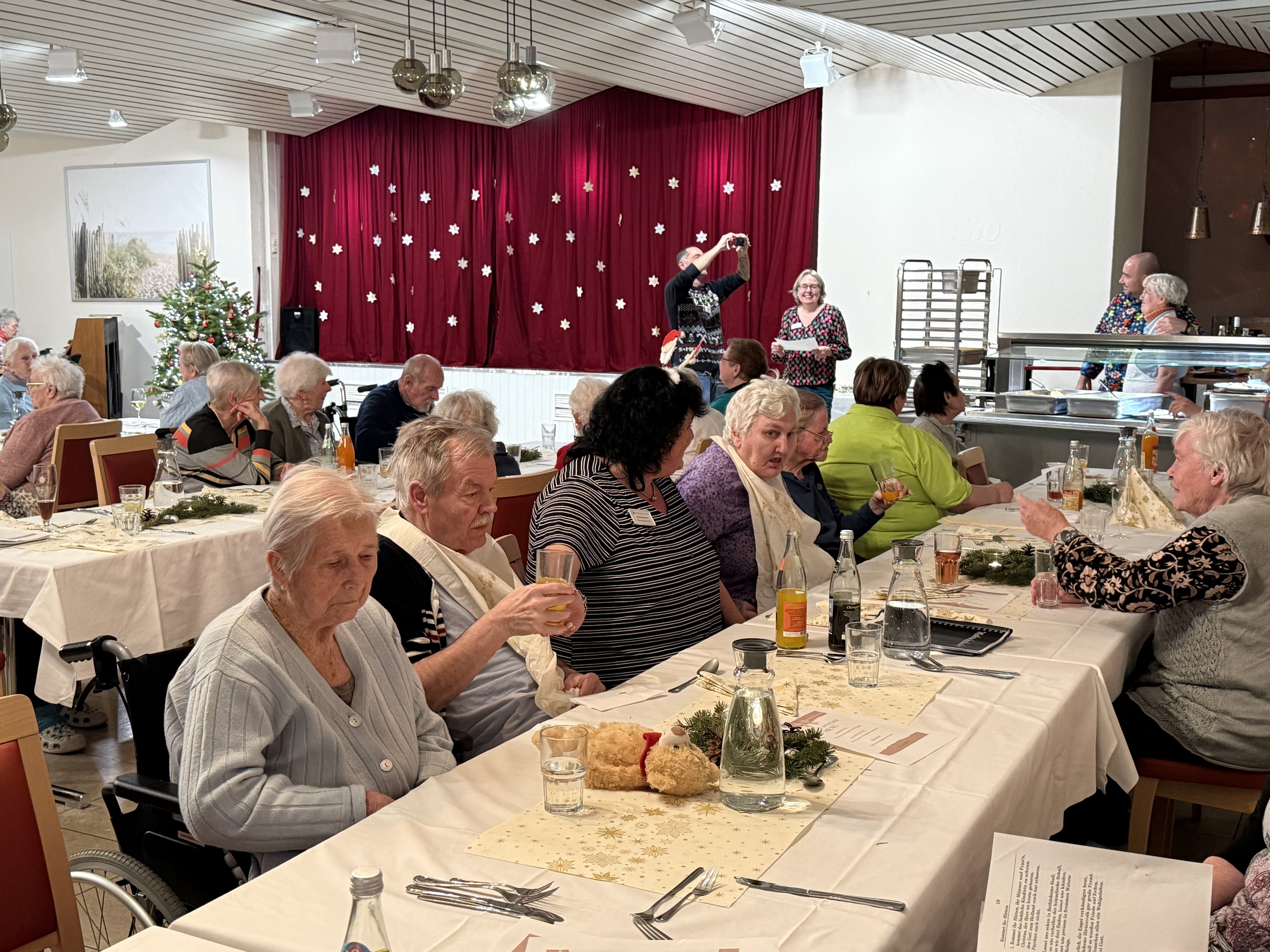 Die Bewohnerinnen genossen ein abwechslungsreiches Programm: Bewohnerinnen lasen Weihnachtsgedichte vor, die Bewohnerinnenharfengruppe „No Name“ mit Frau Severin am Klavier spielte, es wurde gemeinsam gesungen und es gab eine Herbergssuche zu sehen.
