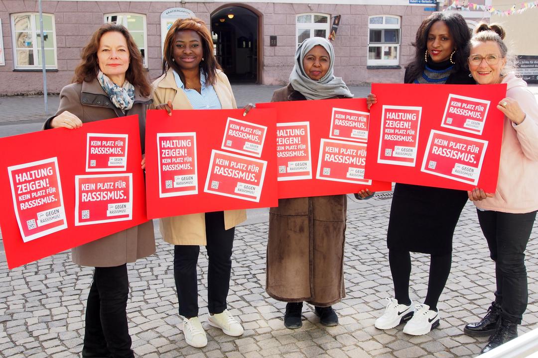 Teilnehmerinnen aus dem Projekt „Stark im Beruf – Mütter mit Migrationshintergrund steigen ein“ aus Somalia, Kongo und Tansania verteilten zum Beispiel Postkarten und Sticker. Darüber kamen sie mit Passanten ins Gespräch und erfuhren positives Feedback für ihr Engagement gegen Rassismus.