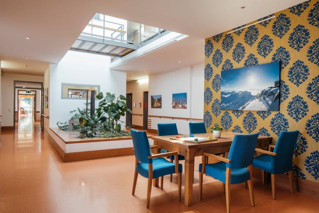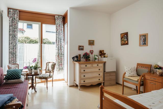 Die hellen und freundlichen Zimmer sind nur mit einem Pflegebett und einem Nachttisch ausgestattet, damit die Bewohner*innen eigene Möbel mitbringen und sich ganz nach ihren persönlichen Wünschen einrichten können. Selbstverständlich haben alle Zimmer